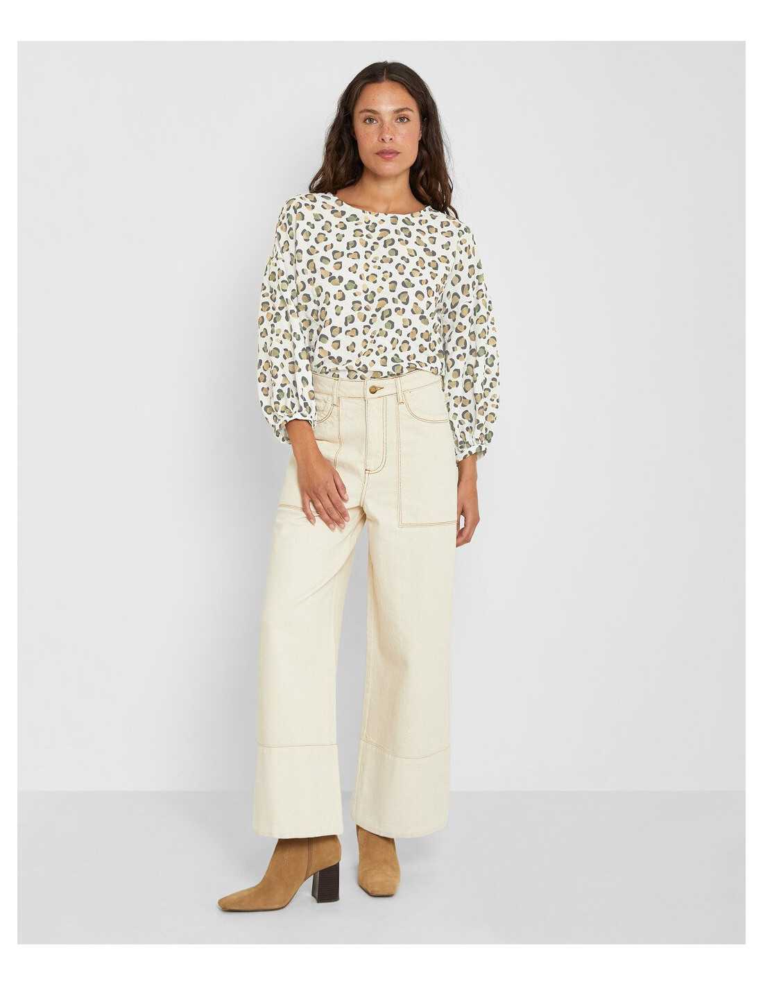 Blusa animal print de manga francesa abombada, cuello redondo cerrado y cierre trasero en parte superior