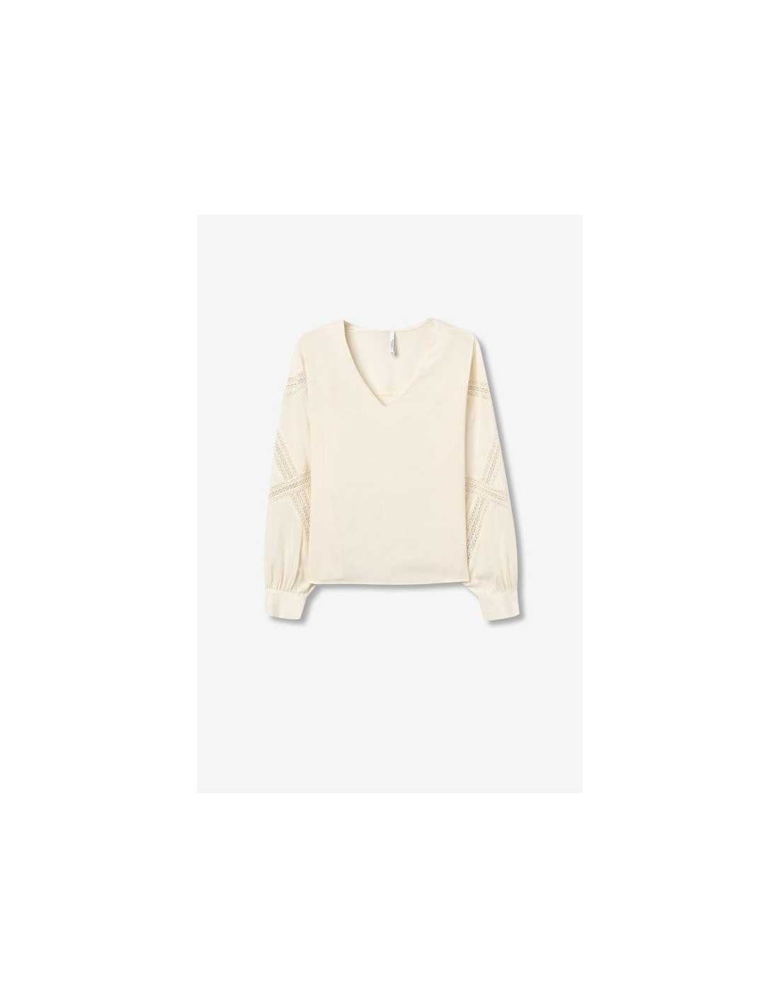 Blusa regular fit con recortes de encaje, escote en V y manga larga con puños abotonados.