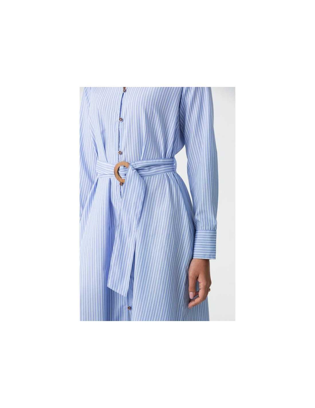 Vestido camisero largo, con cuello solapa y escote en pico. Cierre de botones y cinturón del mismo tejido con hebilla.