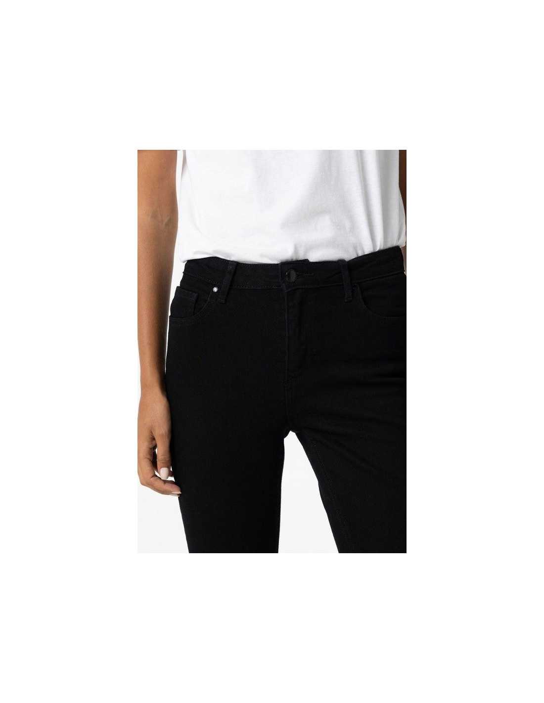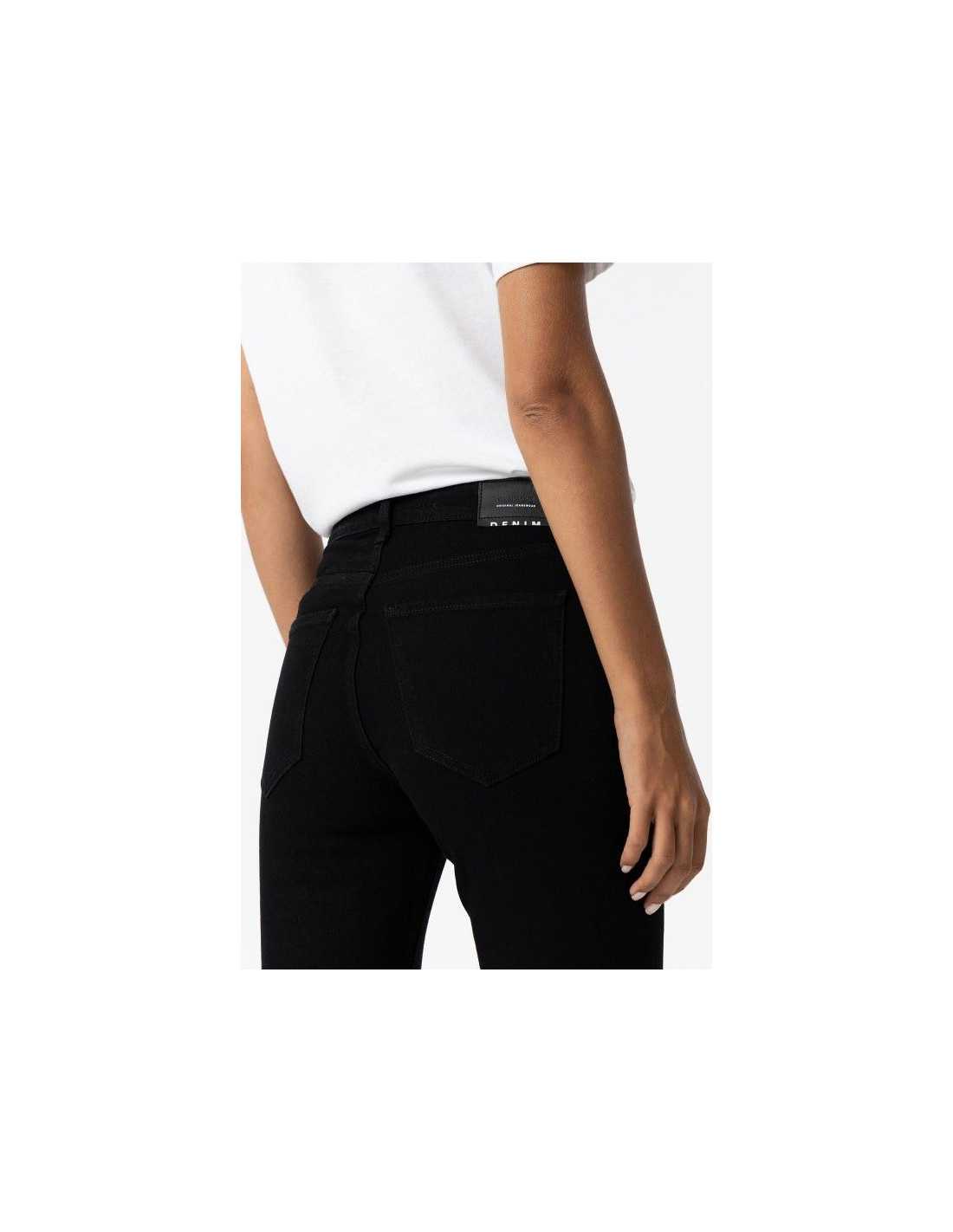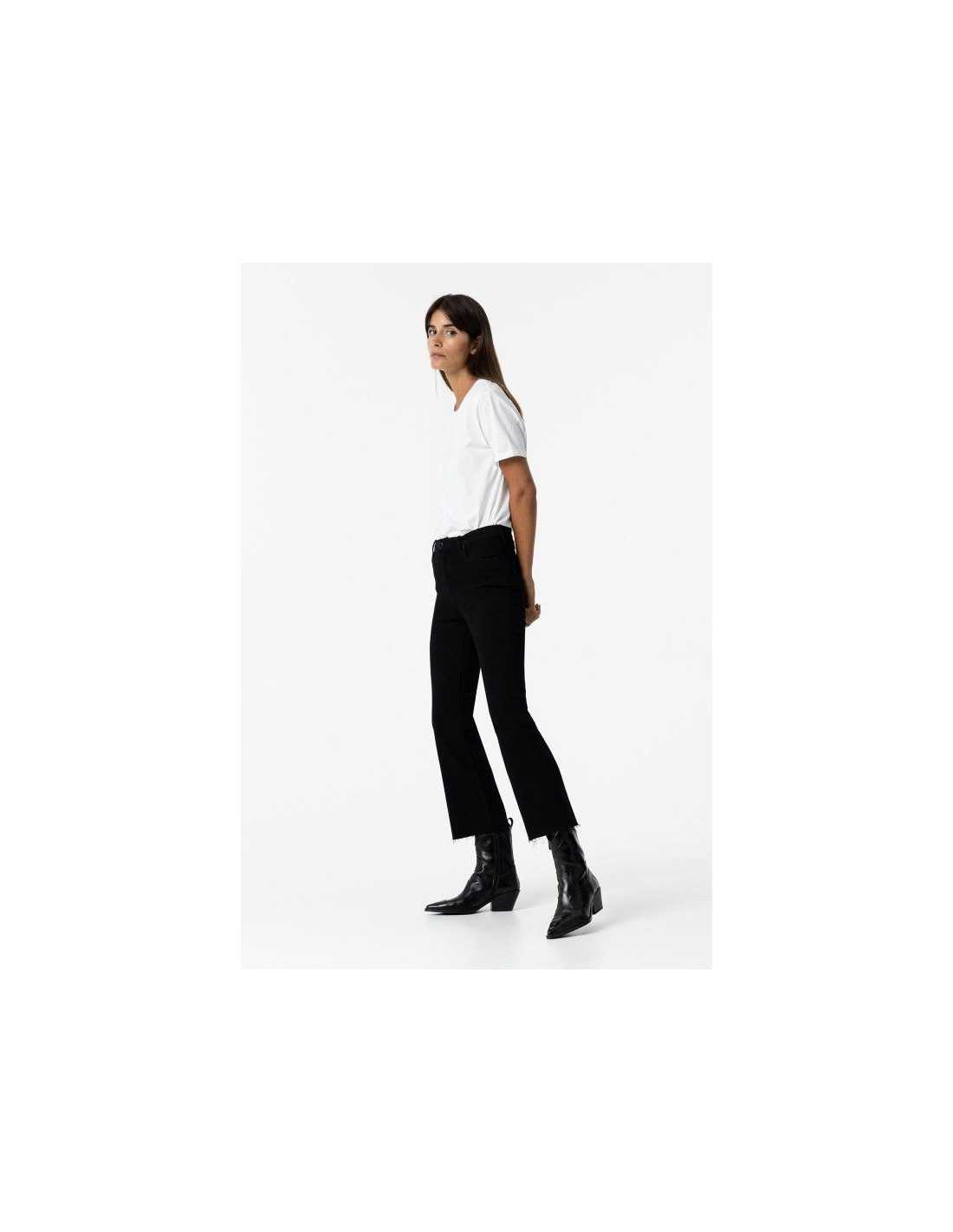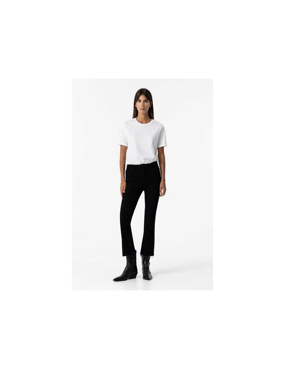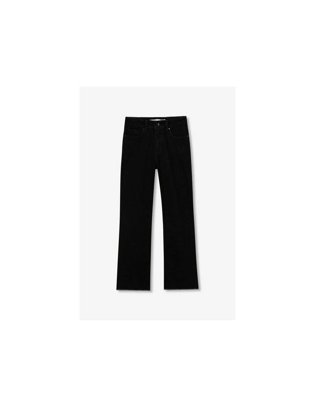 Jeans de tiro alto con cinco bolsillos. Cierre frontal con cremallera y botón metálico. Bajo con acabado deshilachado.
