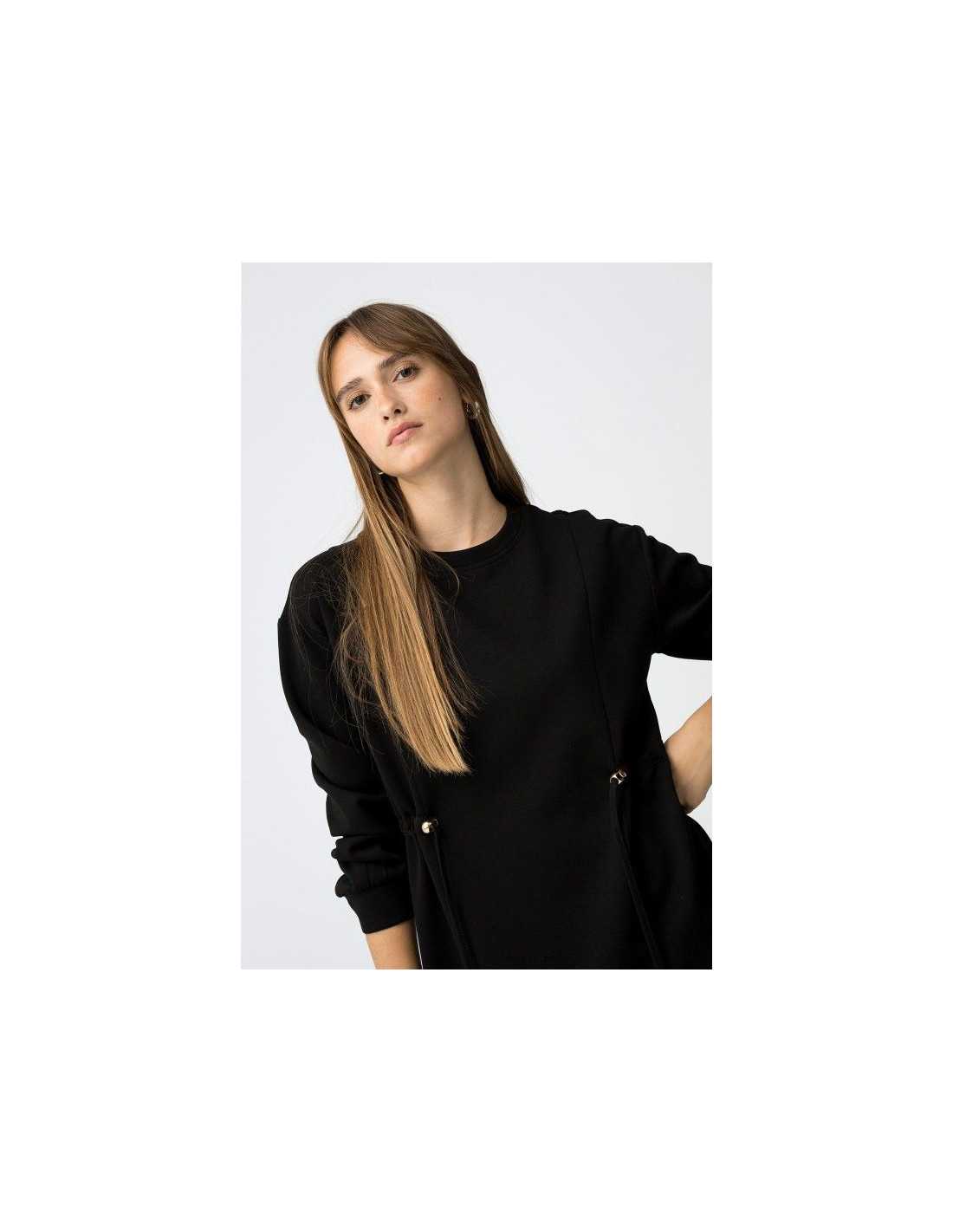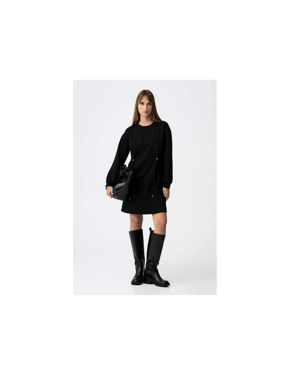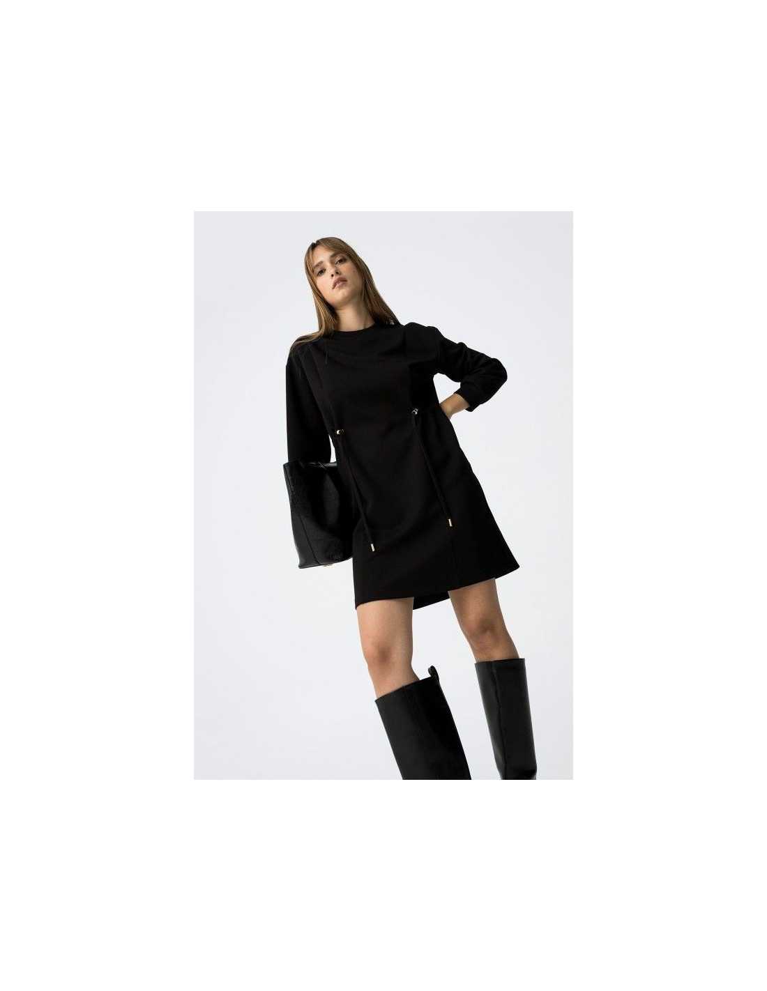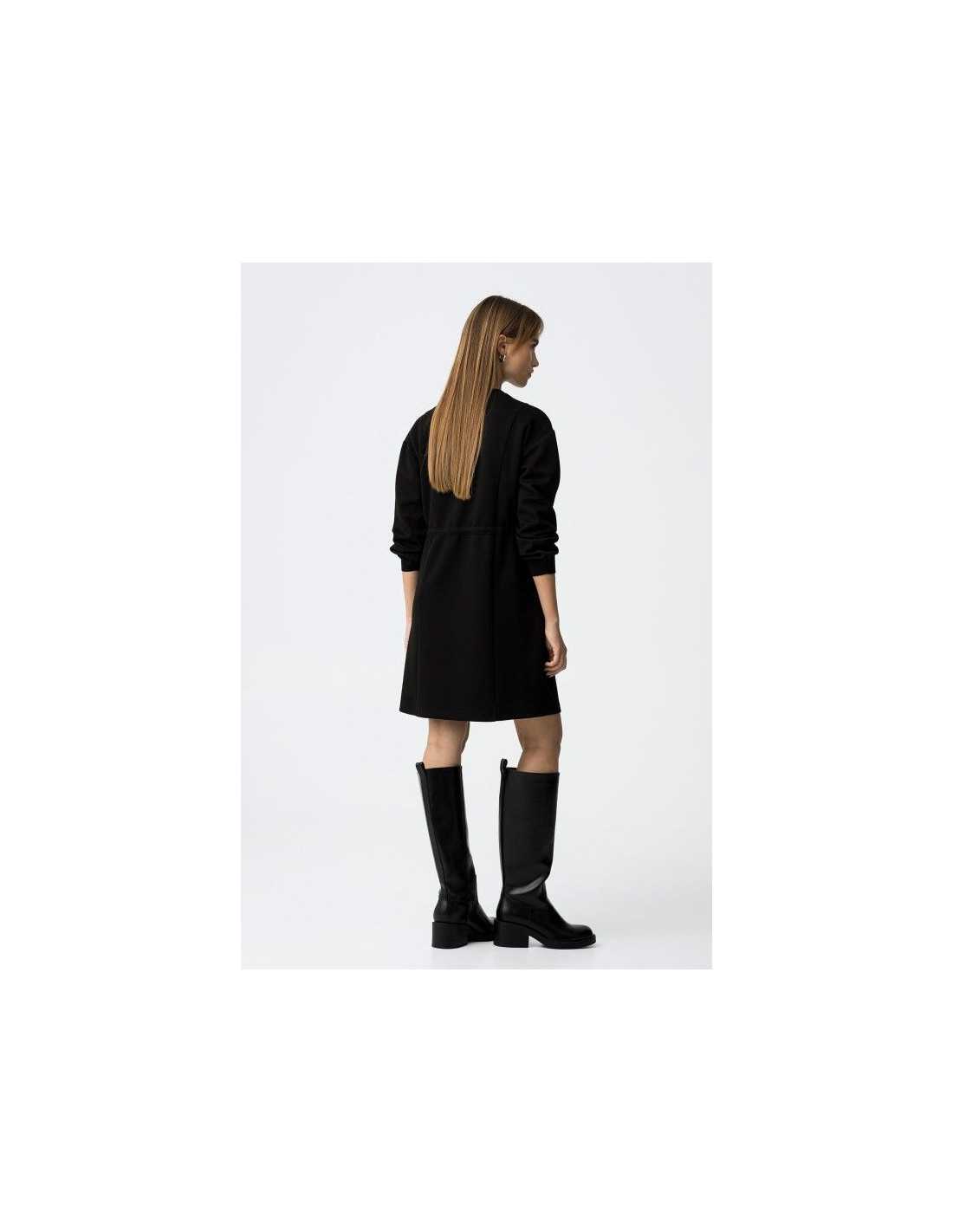 Vestido corto con escote redondo y manga larga. Detalle de aplicación de cordón del mismo tejido con terminaciones metálicas. Corte recto.