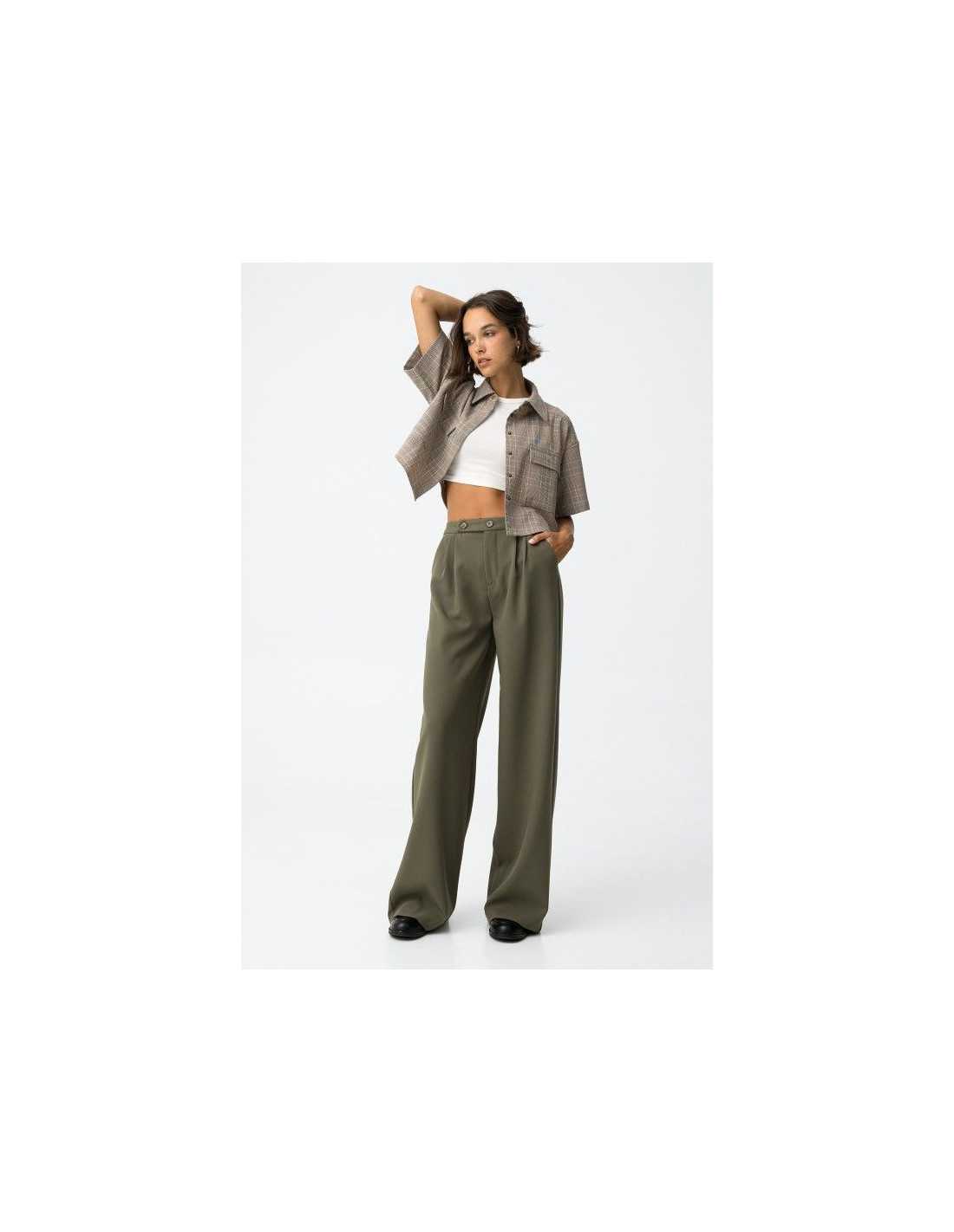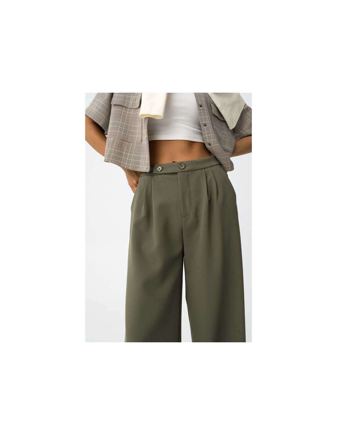 Pantalones wide leg con pliegues de sastrería y dos bolsillos. Cintura alta con cierre de cremallera y botones.