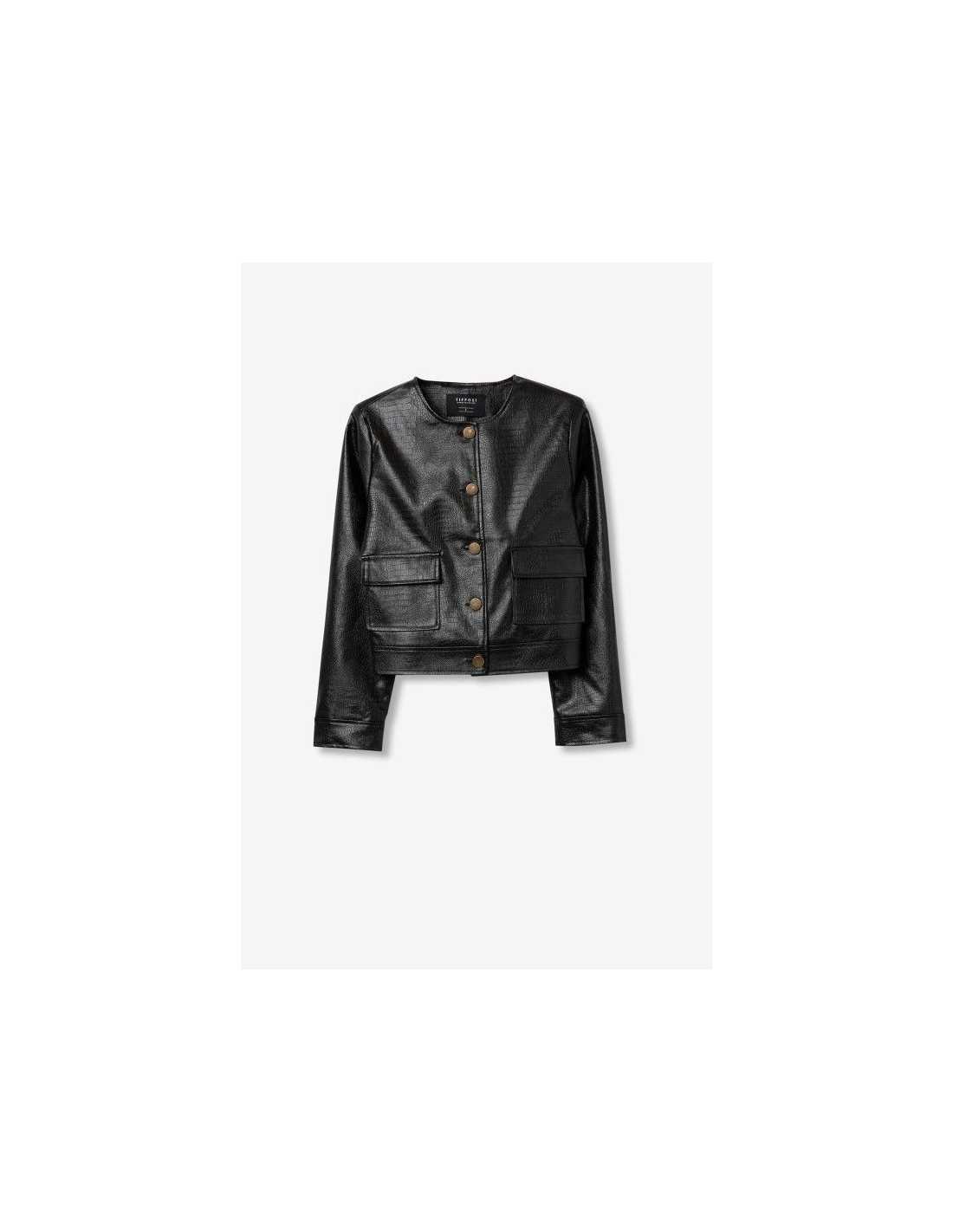 Chaqueta regular fit con efecto piel de cocodrilo y dos bolsillos con solapa delanteros. Escote redondo, manga larga y cierre frontal con botón metálico.