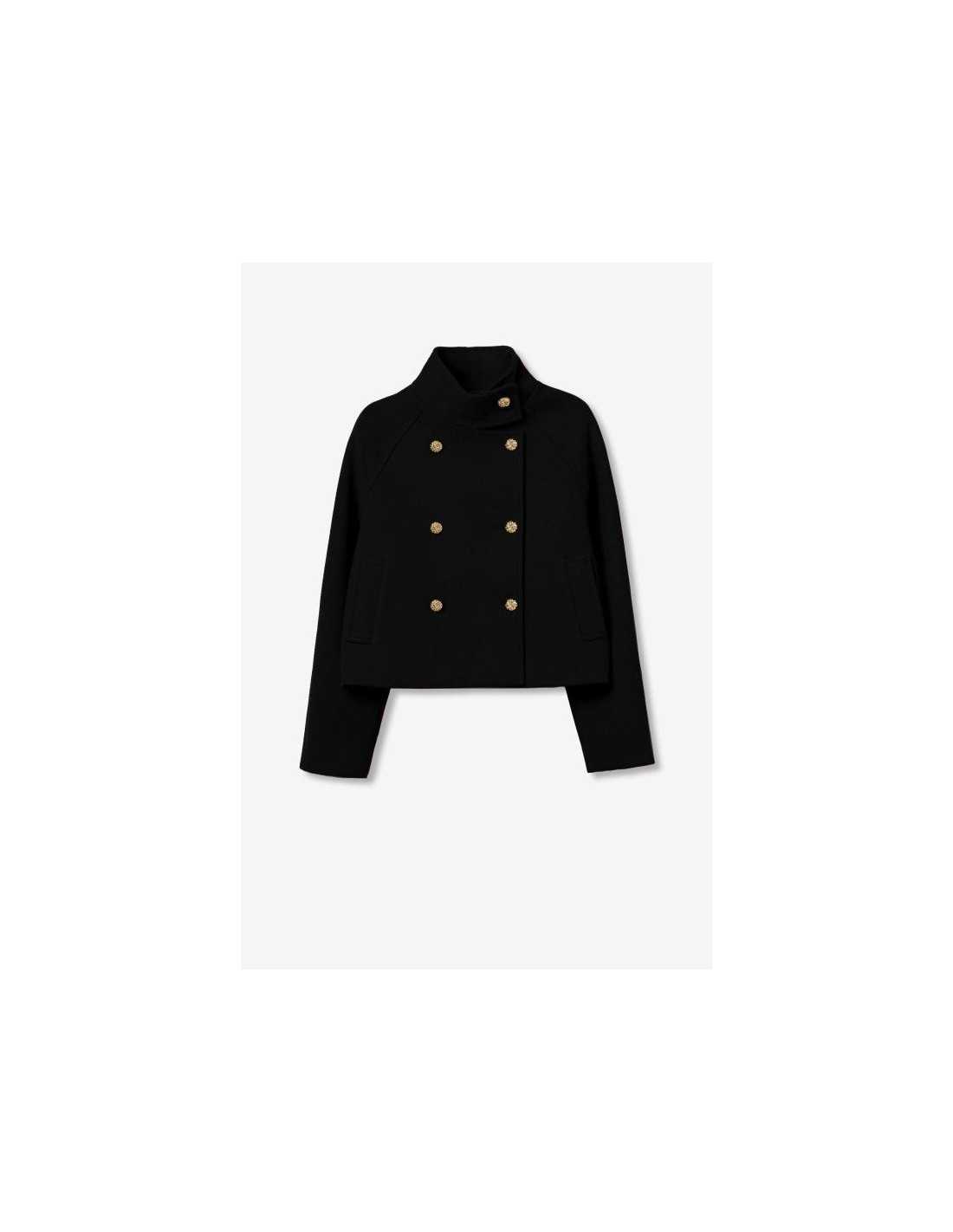Chaqueta corta relaxed fit con doble cruce, dos bolsillos frontales y cierre de botones metálicos. Cuello alto y manga larga.