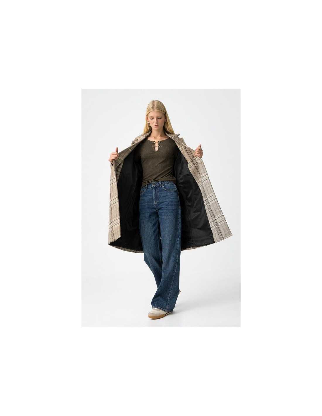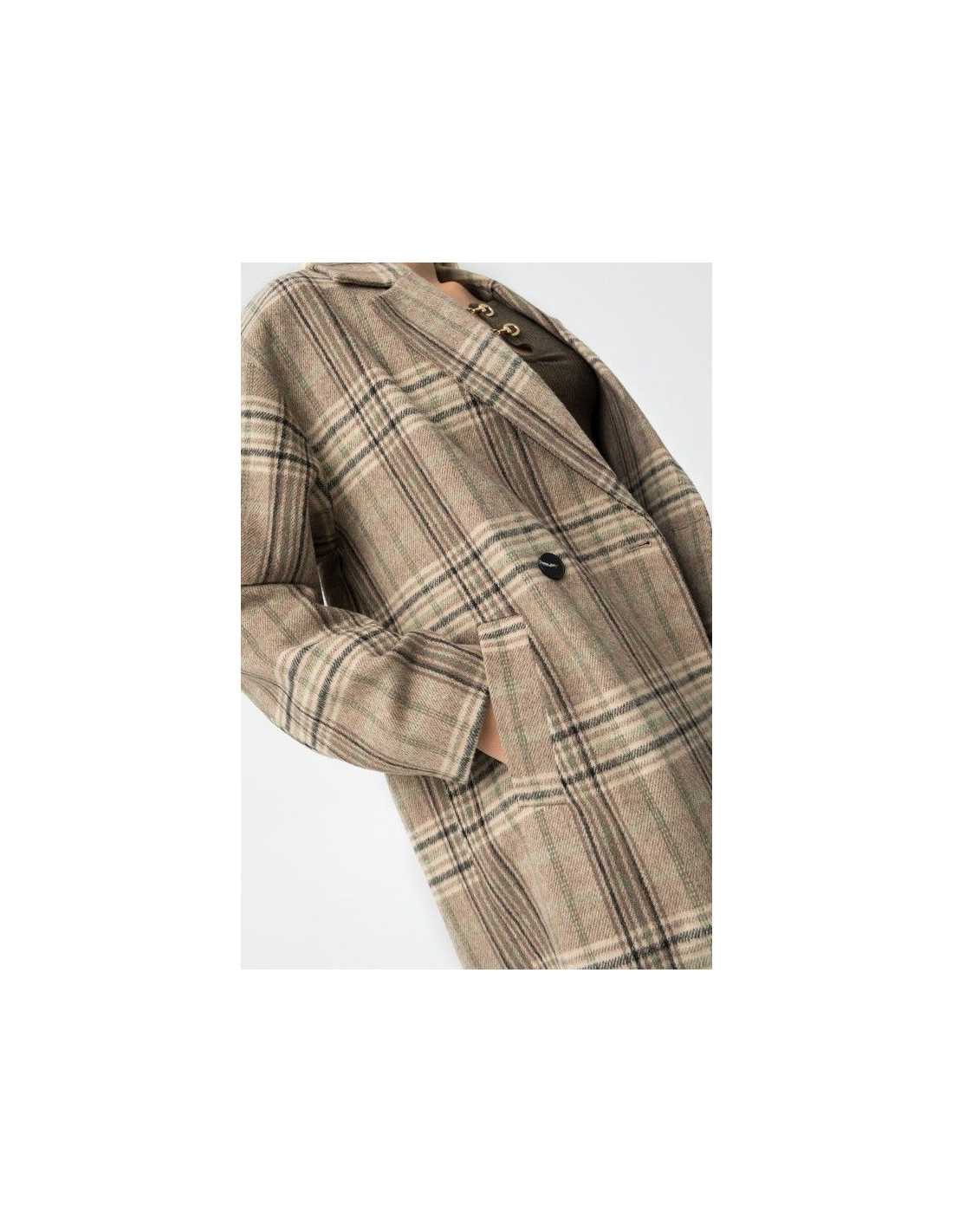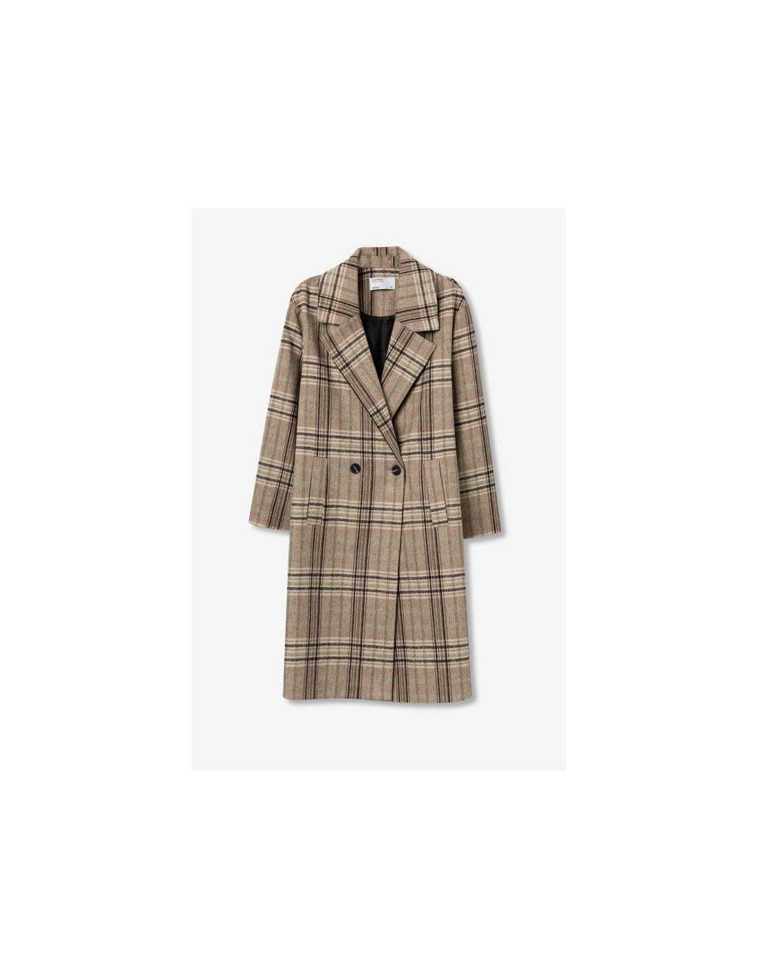 Abrigo largo relaxed fit, con estampado de cuadros y dos bolsillos frontales. Cuello con solapa, manga larga, doble botonadura y cierre de botones.