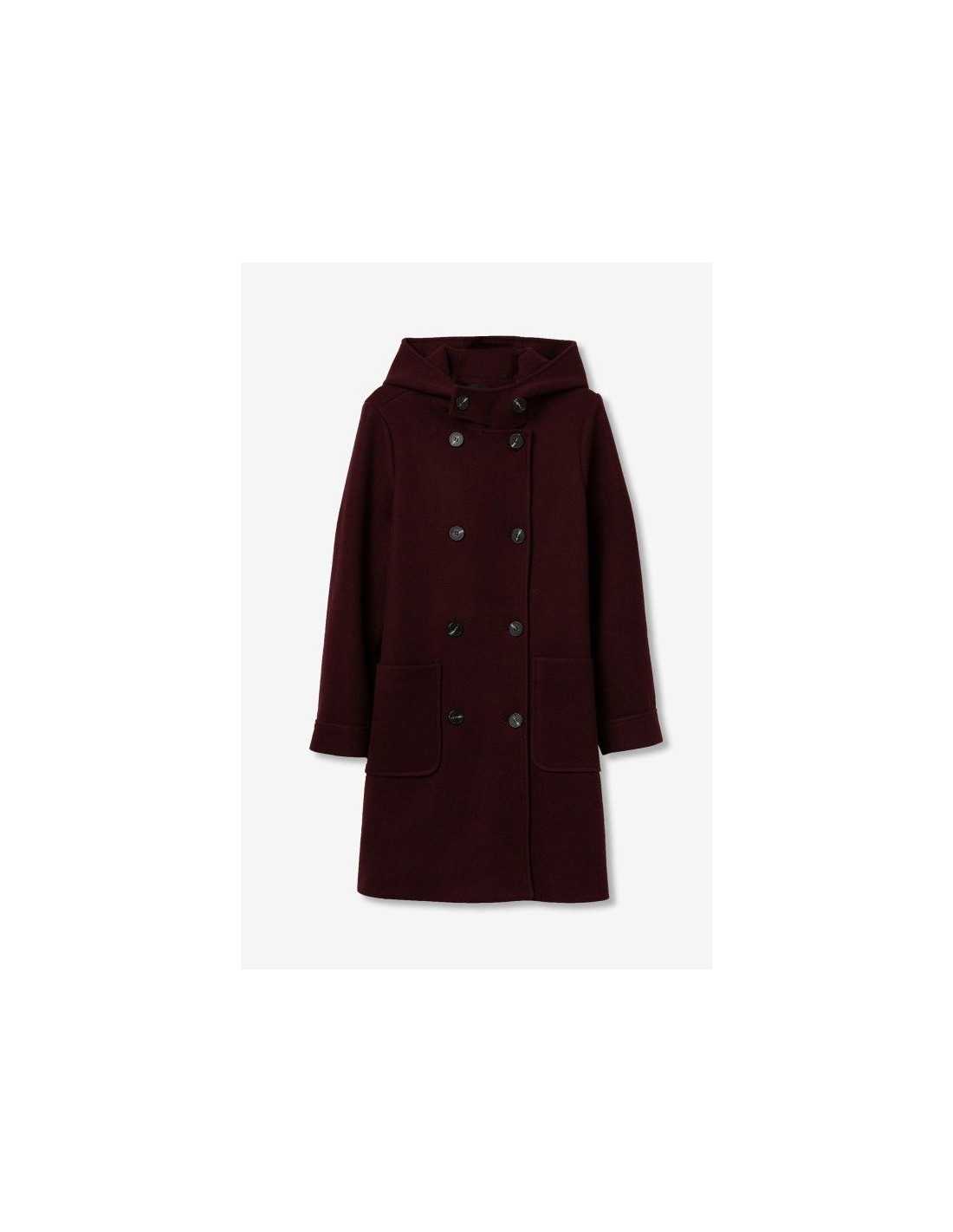 Abrigo largo regular fit, con dos bolsillos frontales, doble botonadura y cierre de botones. Capucha y manga larga.
