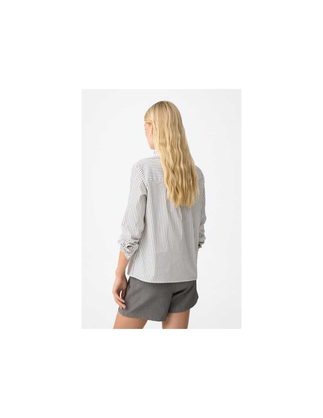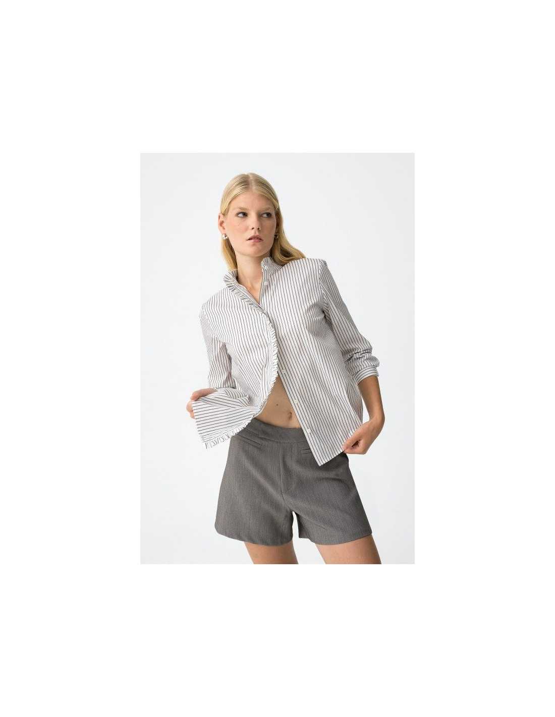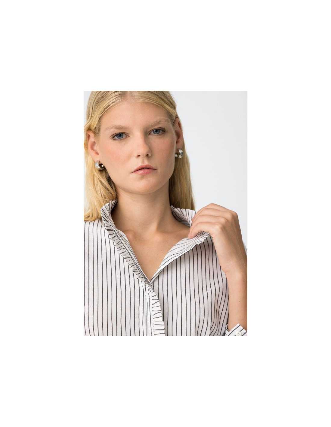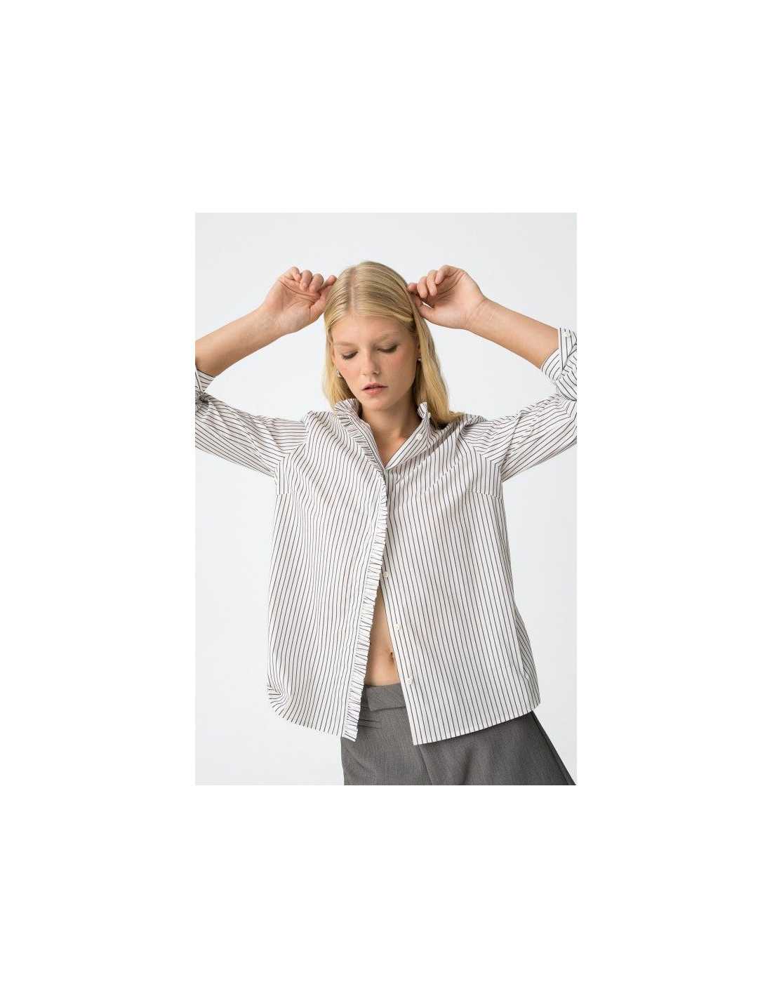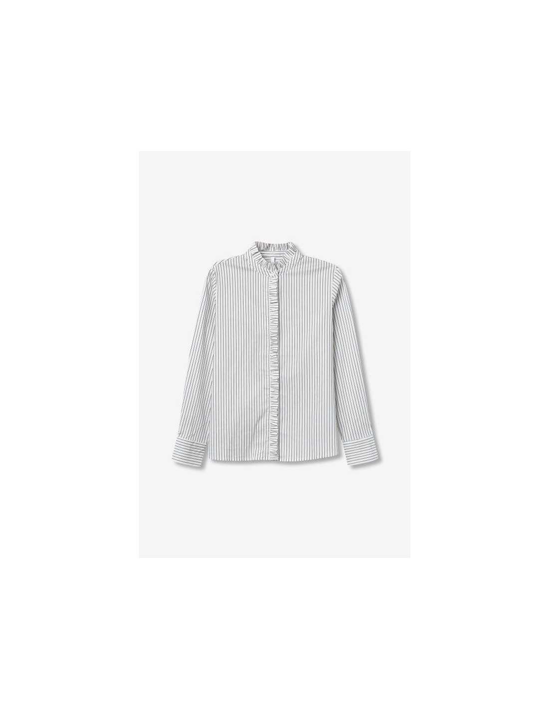 Camisa regular fit de rayas con volante en el cuello y en la tapeta. Cuello redondo, manga larga con botones en los puños y cierre con botón interior.