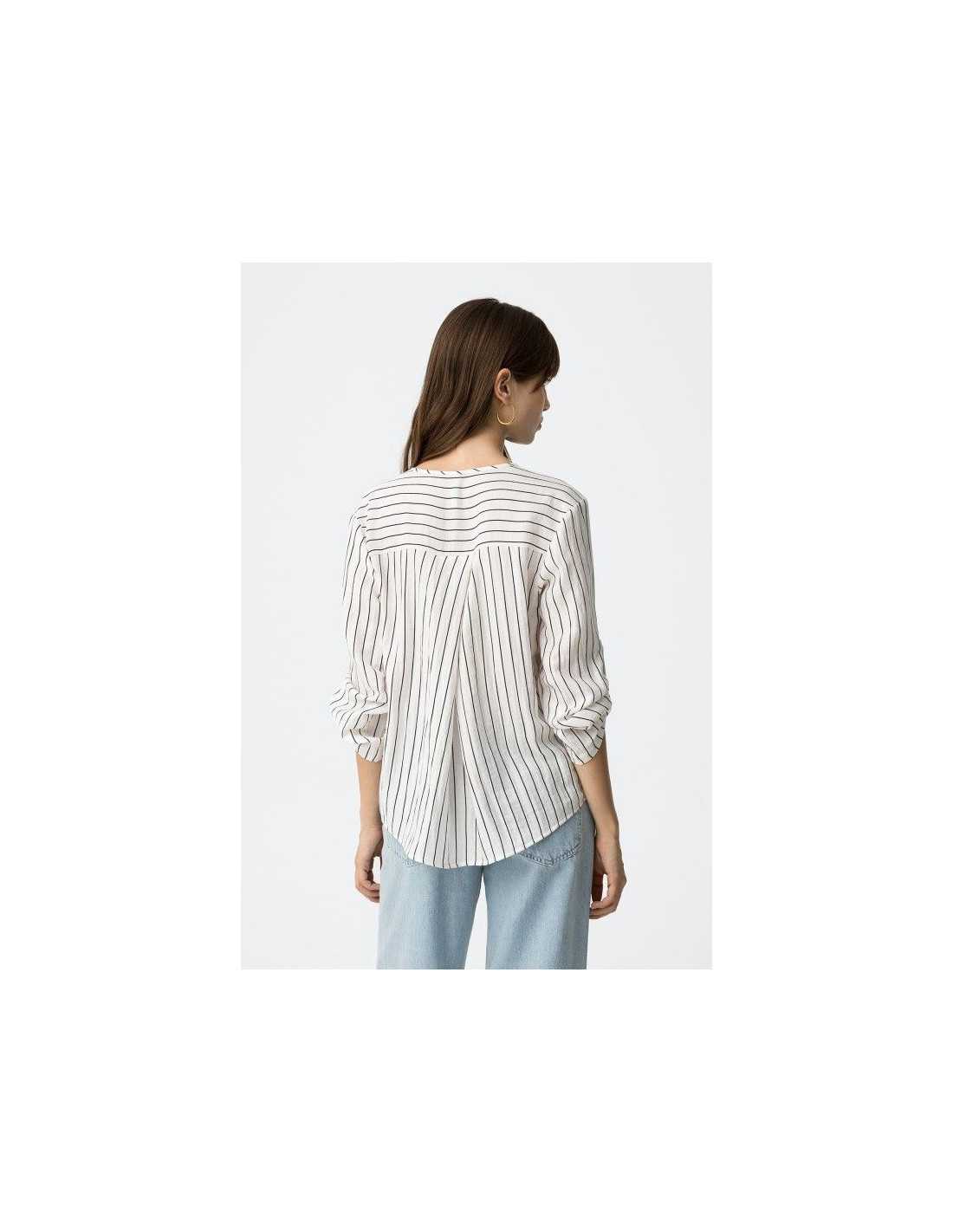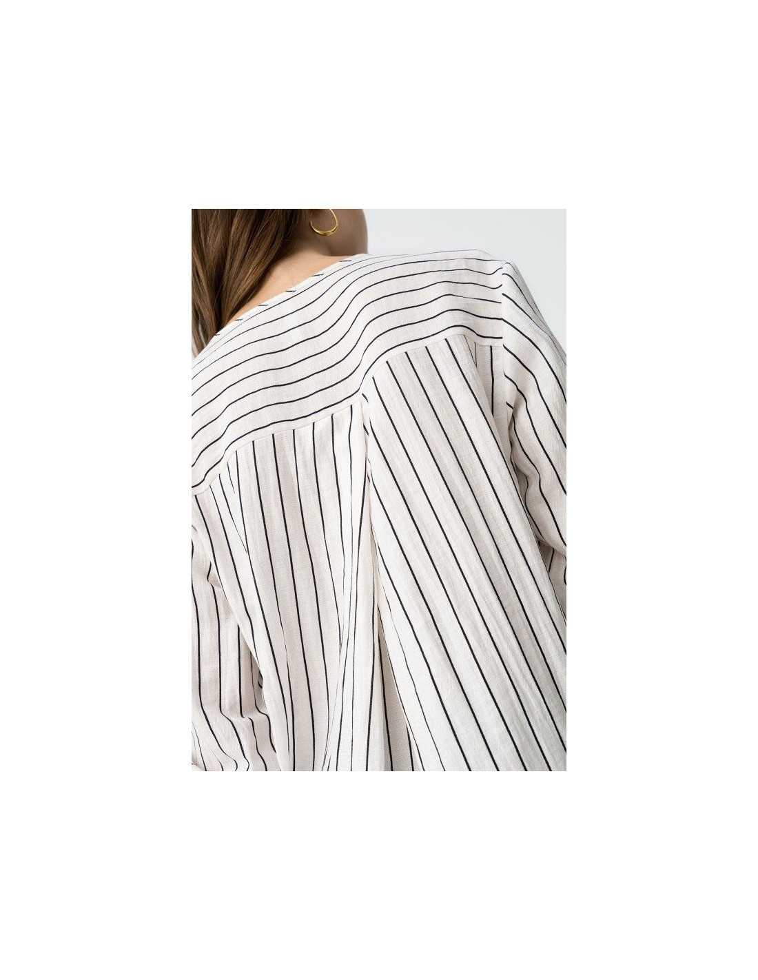 Blusa de manga 3/4 y escote en pico con detalle de pliegue central en la parte delantera. Confeccionado con mezcla de lino.