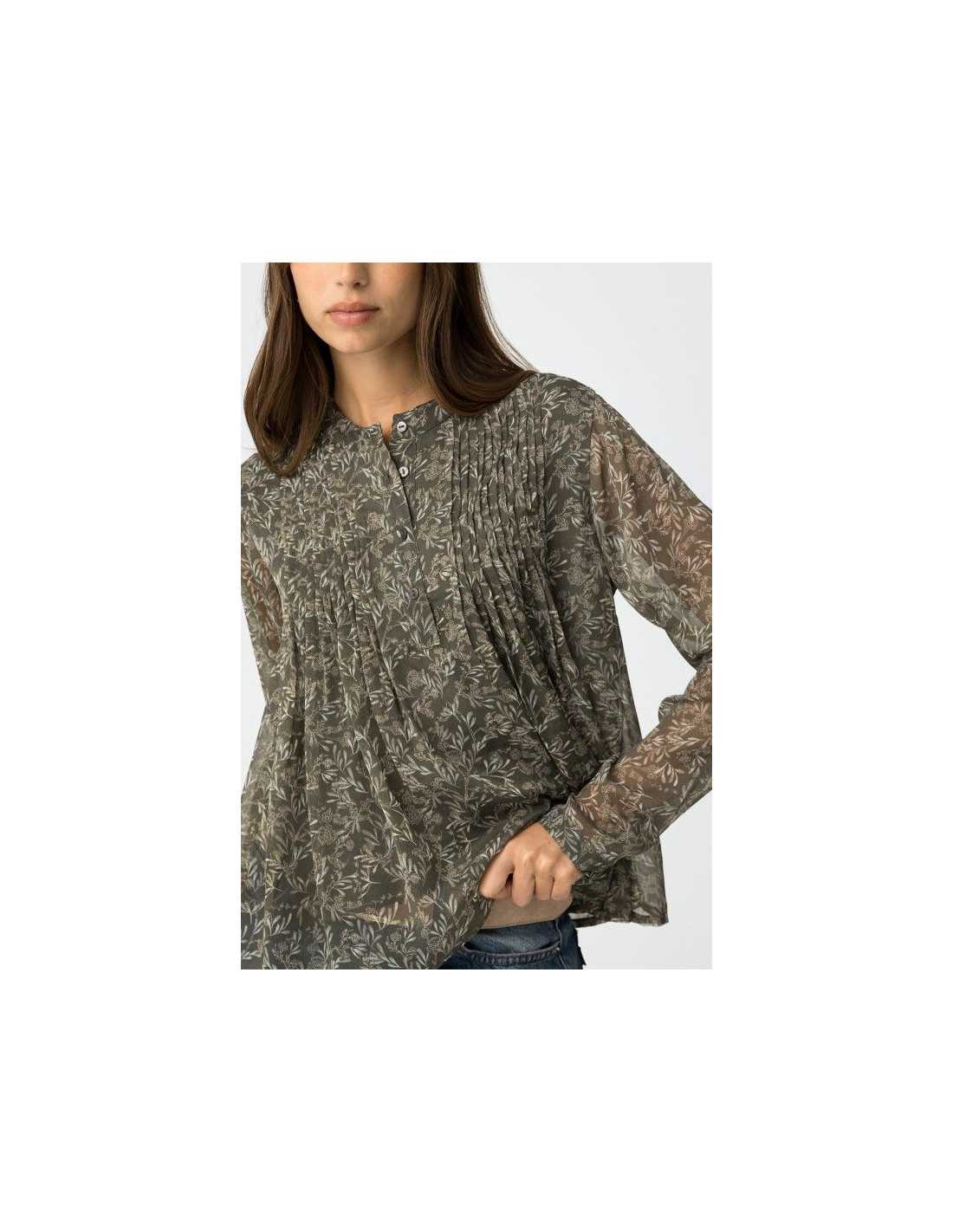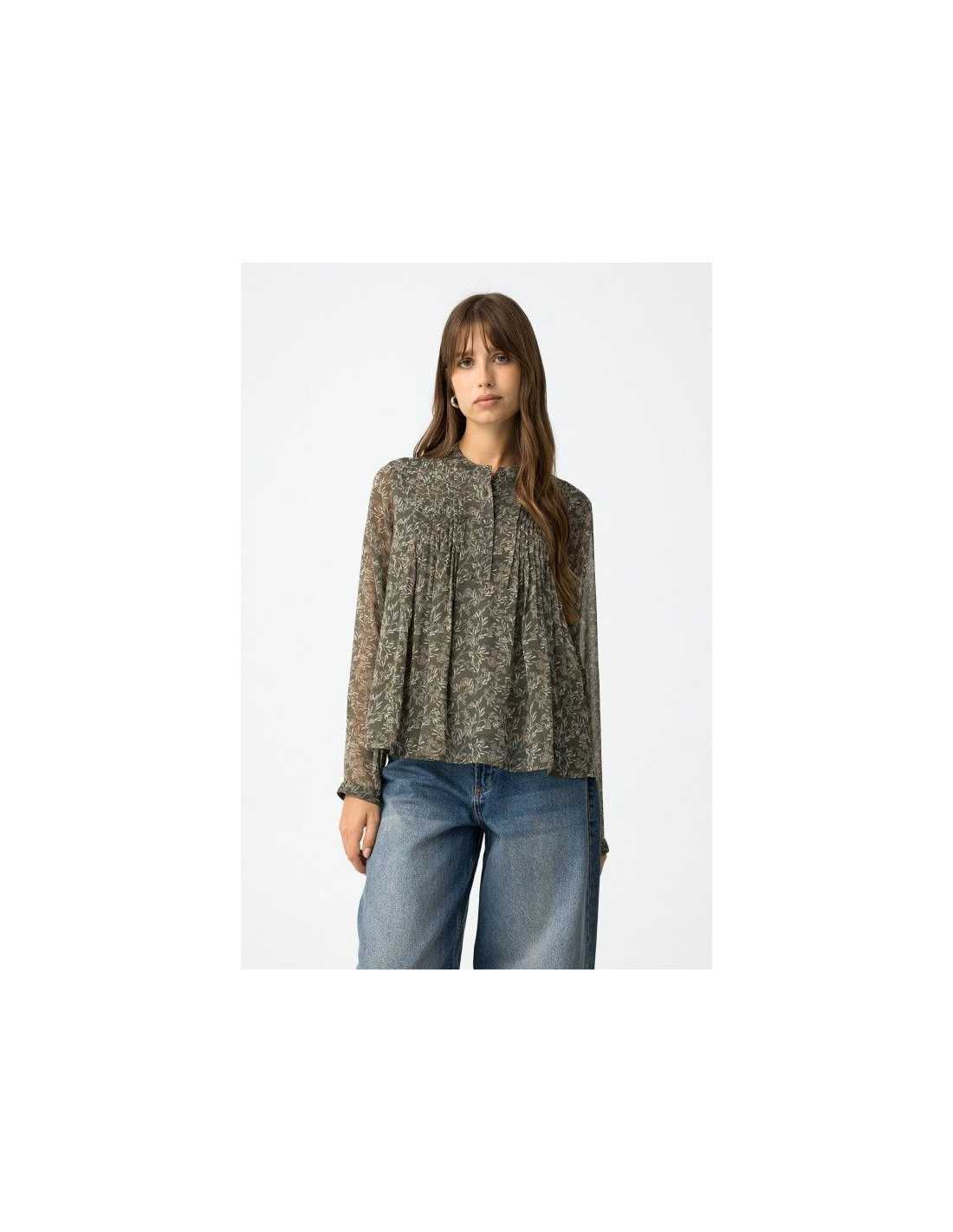 Blusa fluida estampada, con escote redondo, cierre frontal de botón y manga larga.