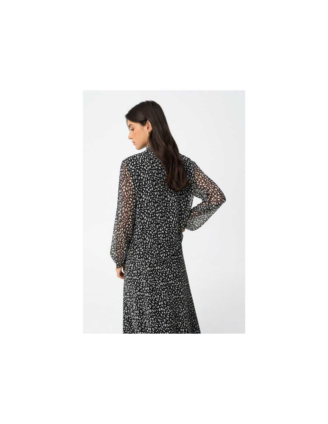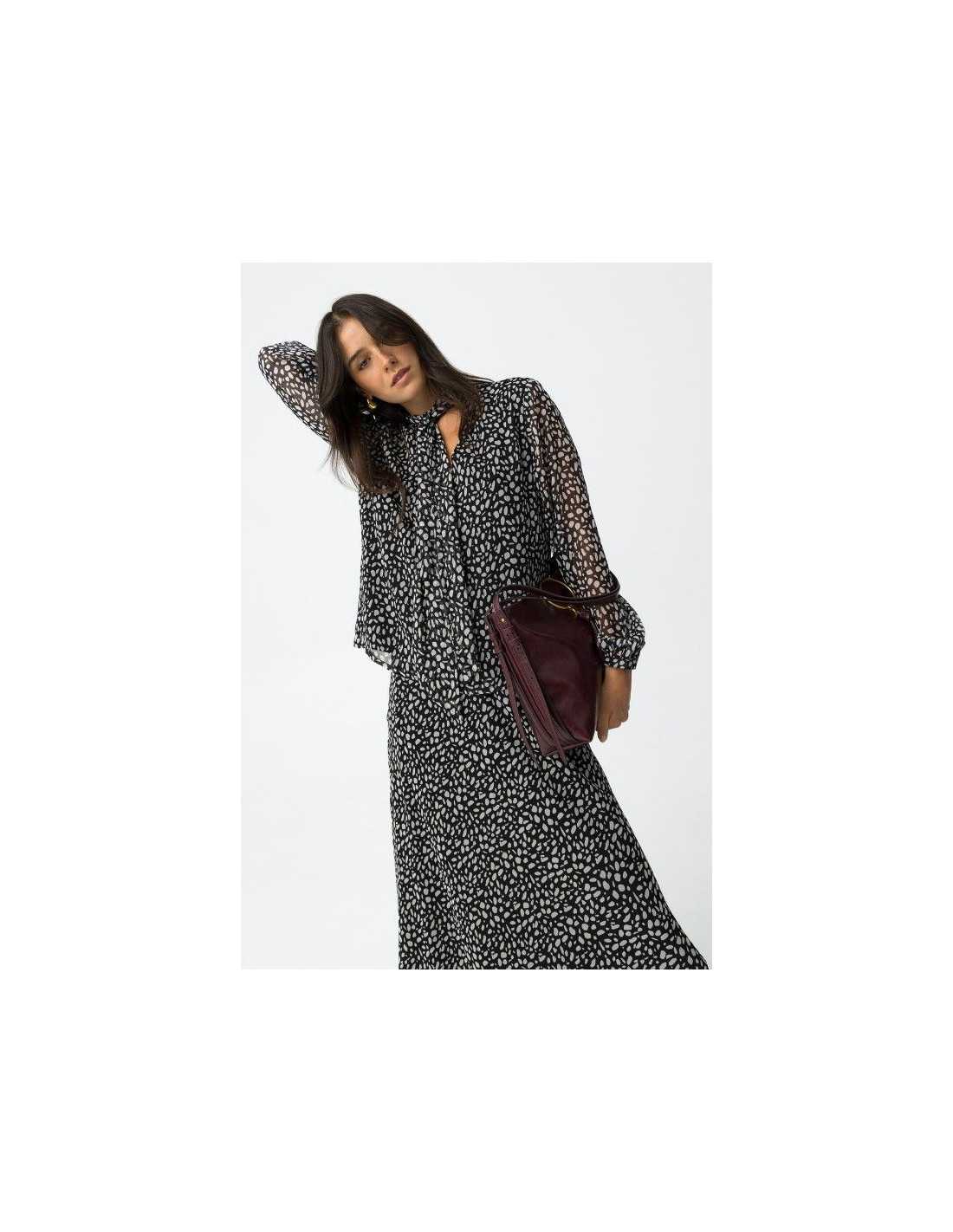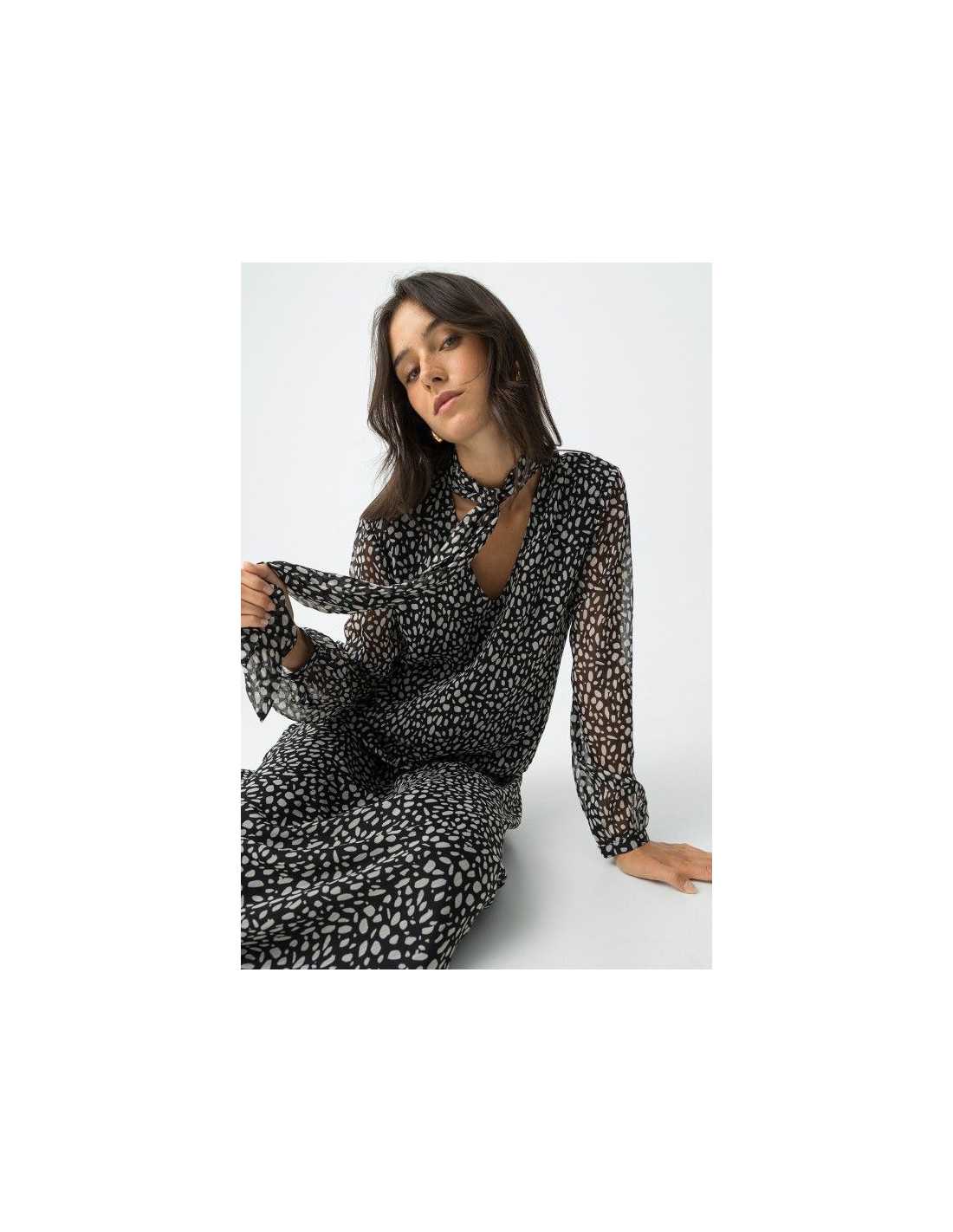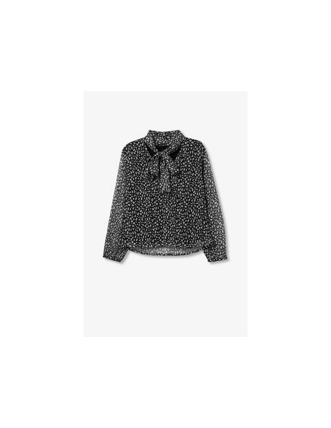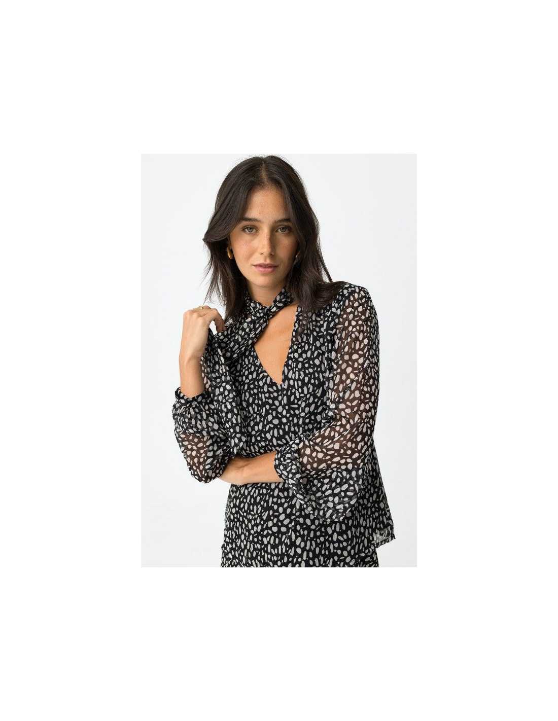 Blusa regular fit estampada, con lazo frontal, cuello en V y manga larga con botones en los puños.