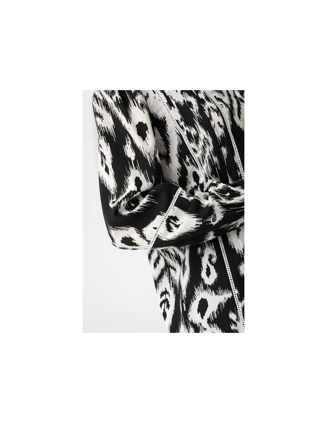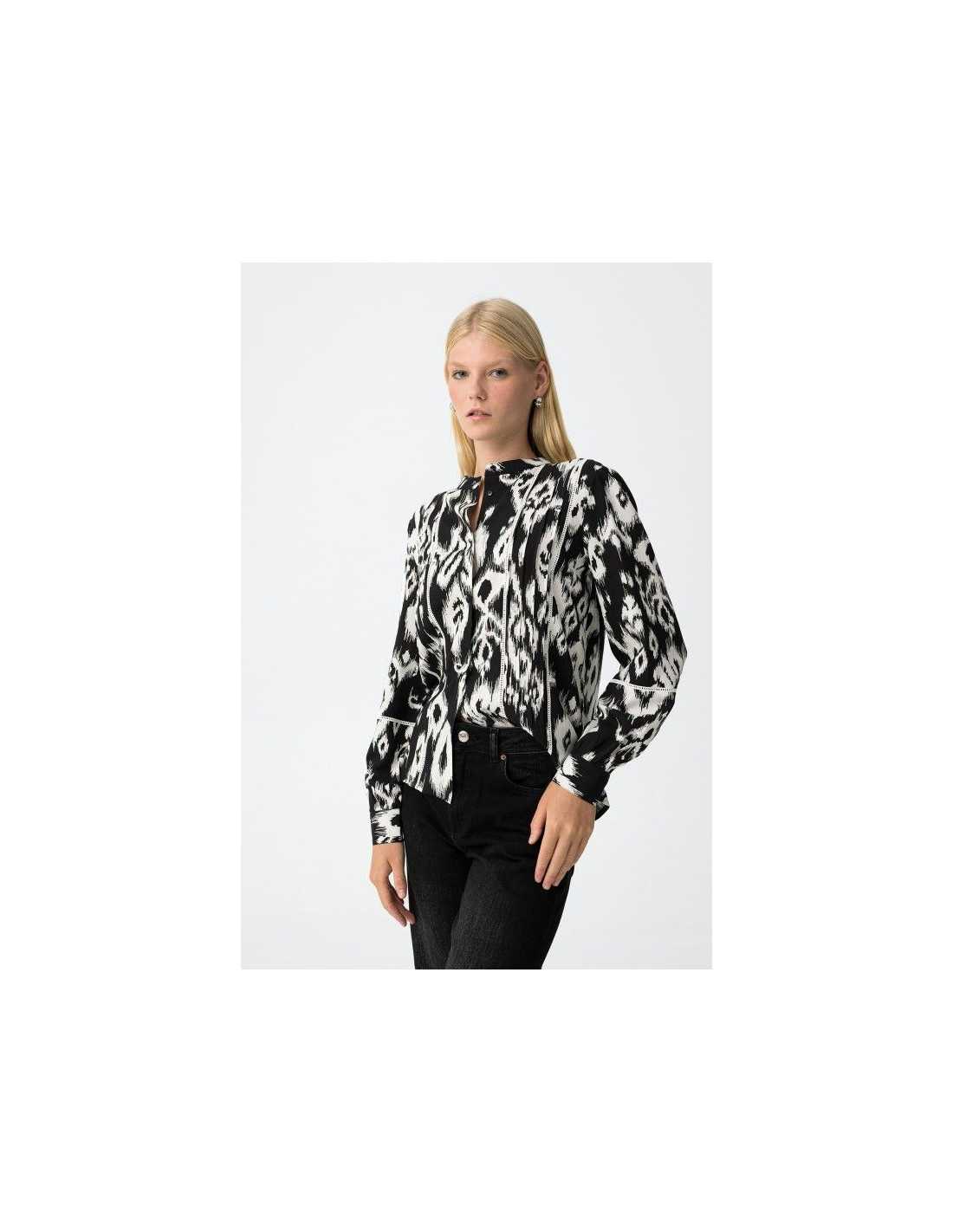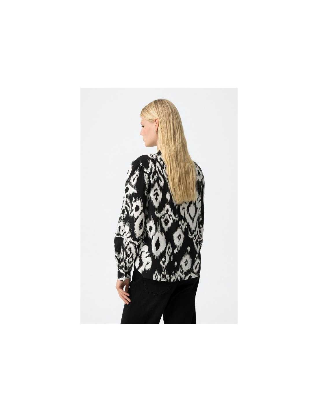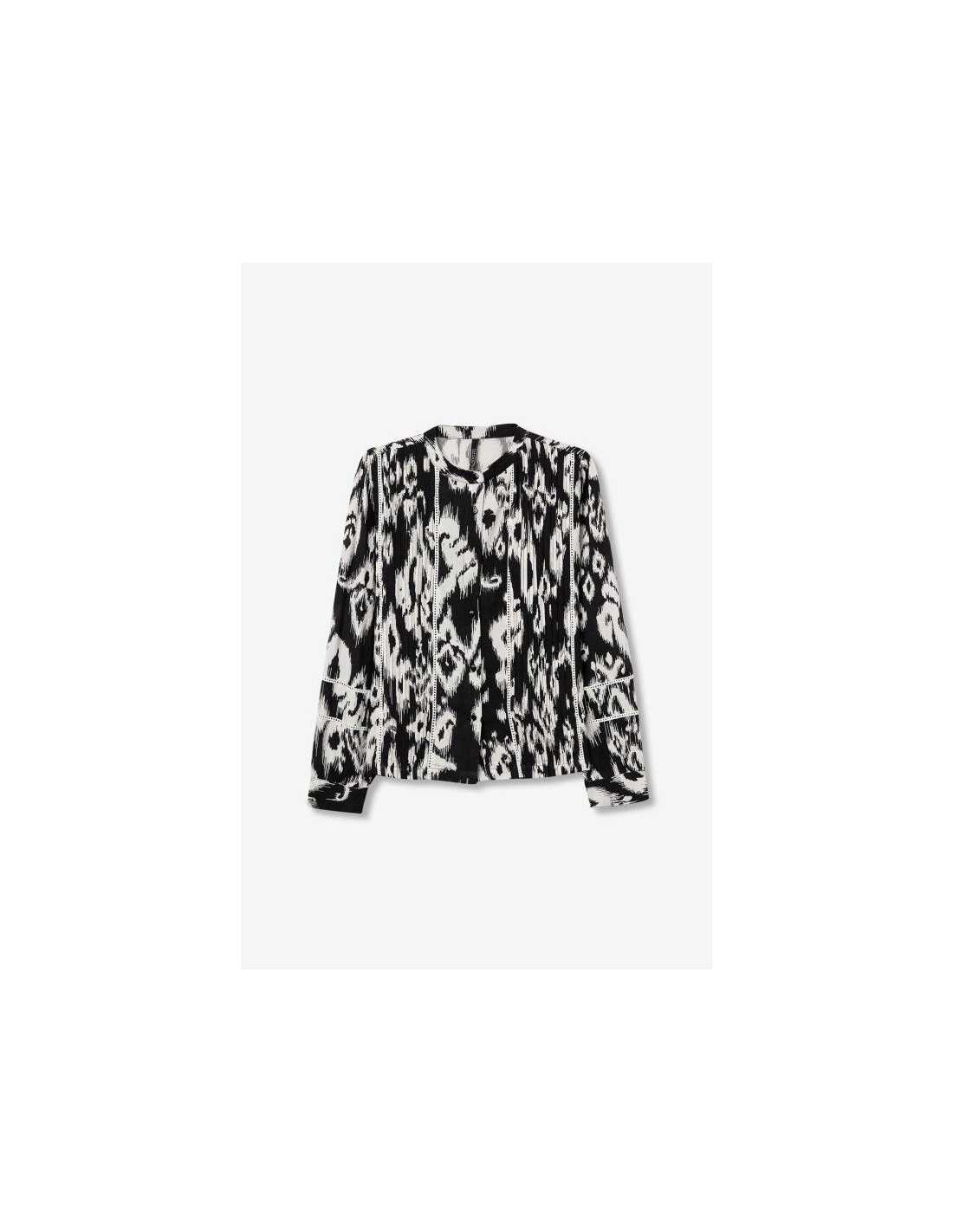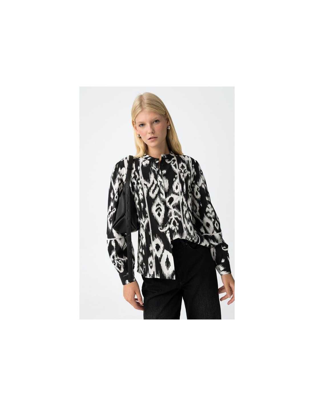 Camisa regular fit con estampado all over y detalles de encaje. Cuello Mao, apertura frontal con botones y manga larga.