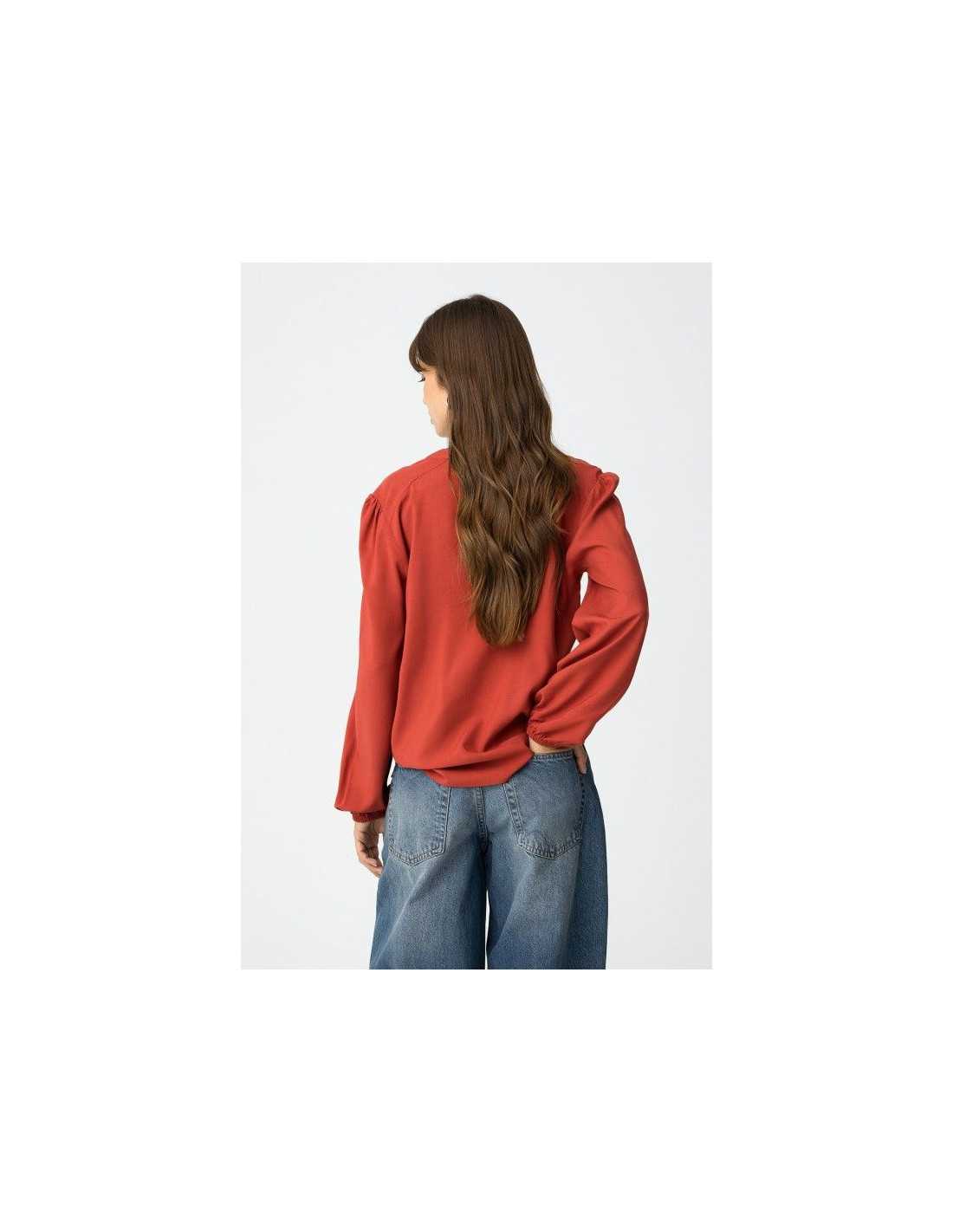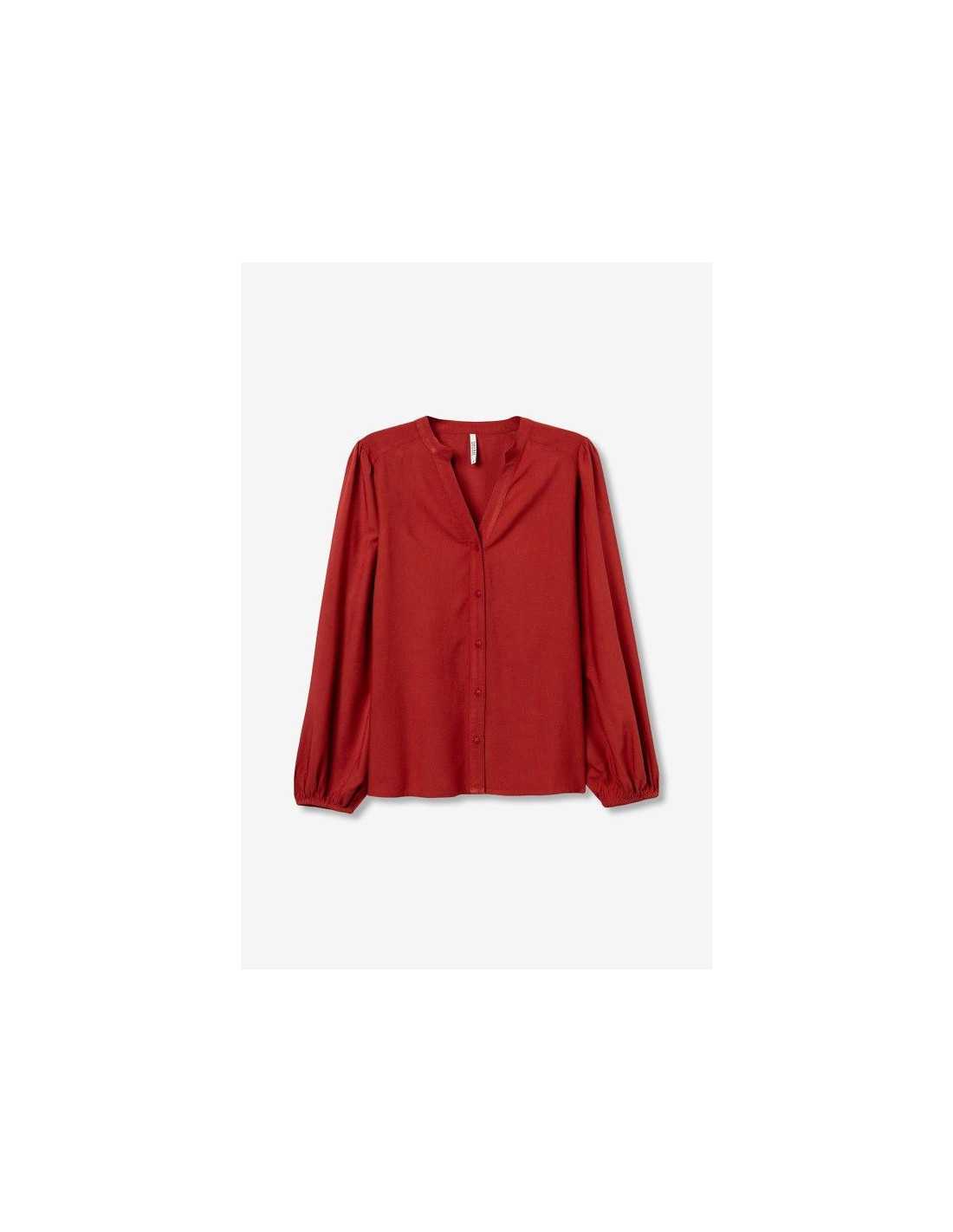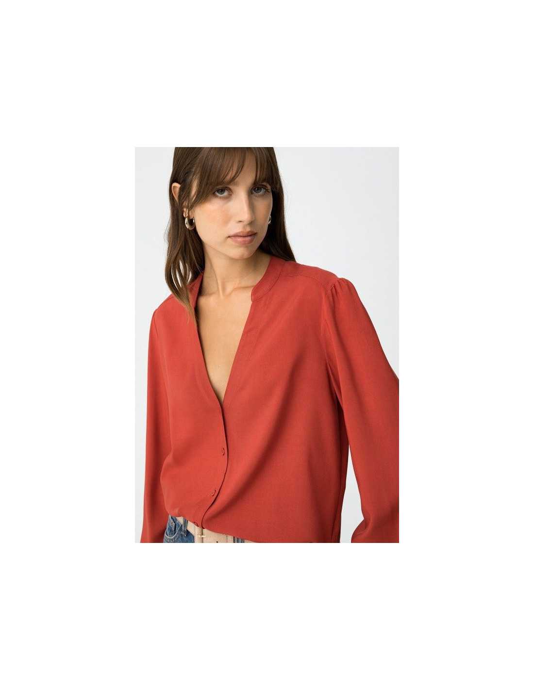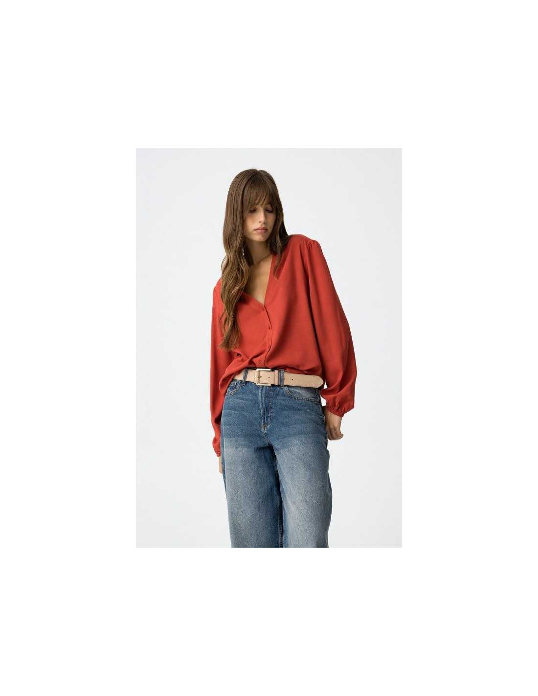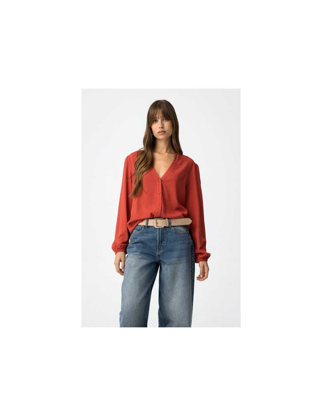 Camisa regular fit con cierre frontal de botones. Escote en V y manga larga con elástico en los puños.