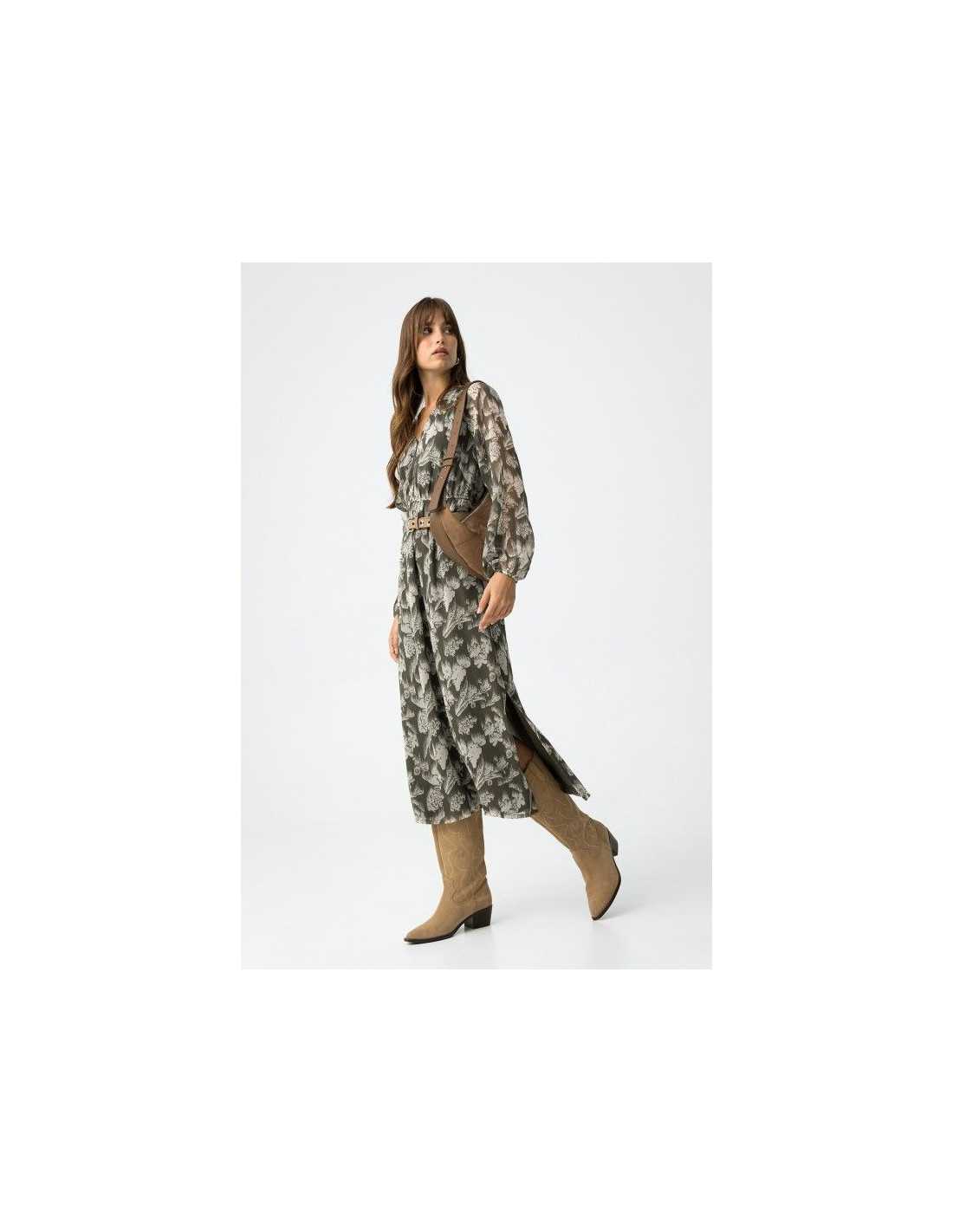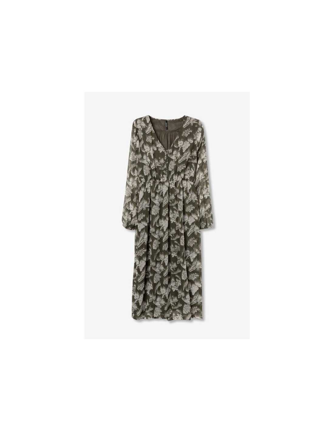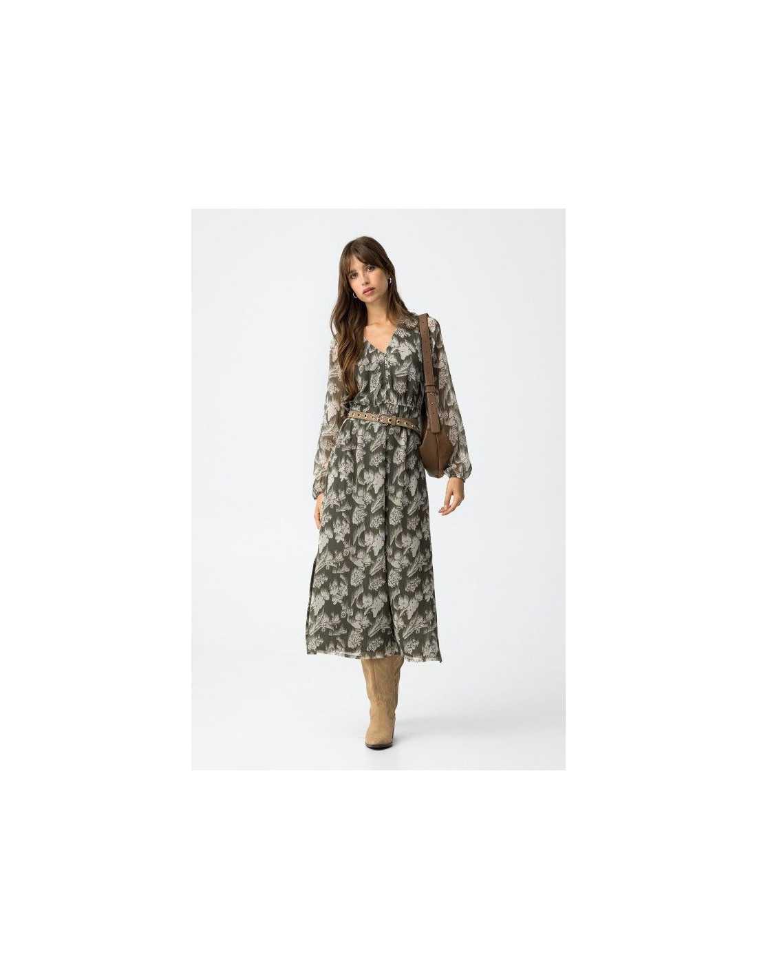 Vestido midi regular fit, semitransparente, con estampado all over y cintura elástica. Escote en V, cierre frontal con botones y manga larga. Interior con forro.