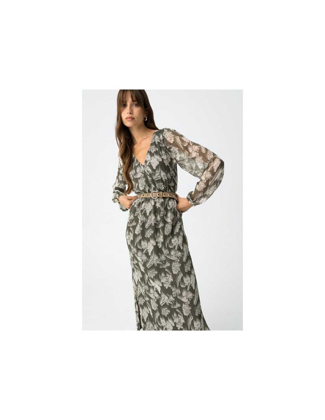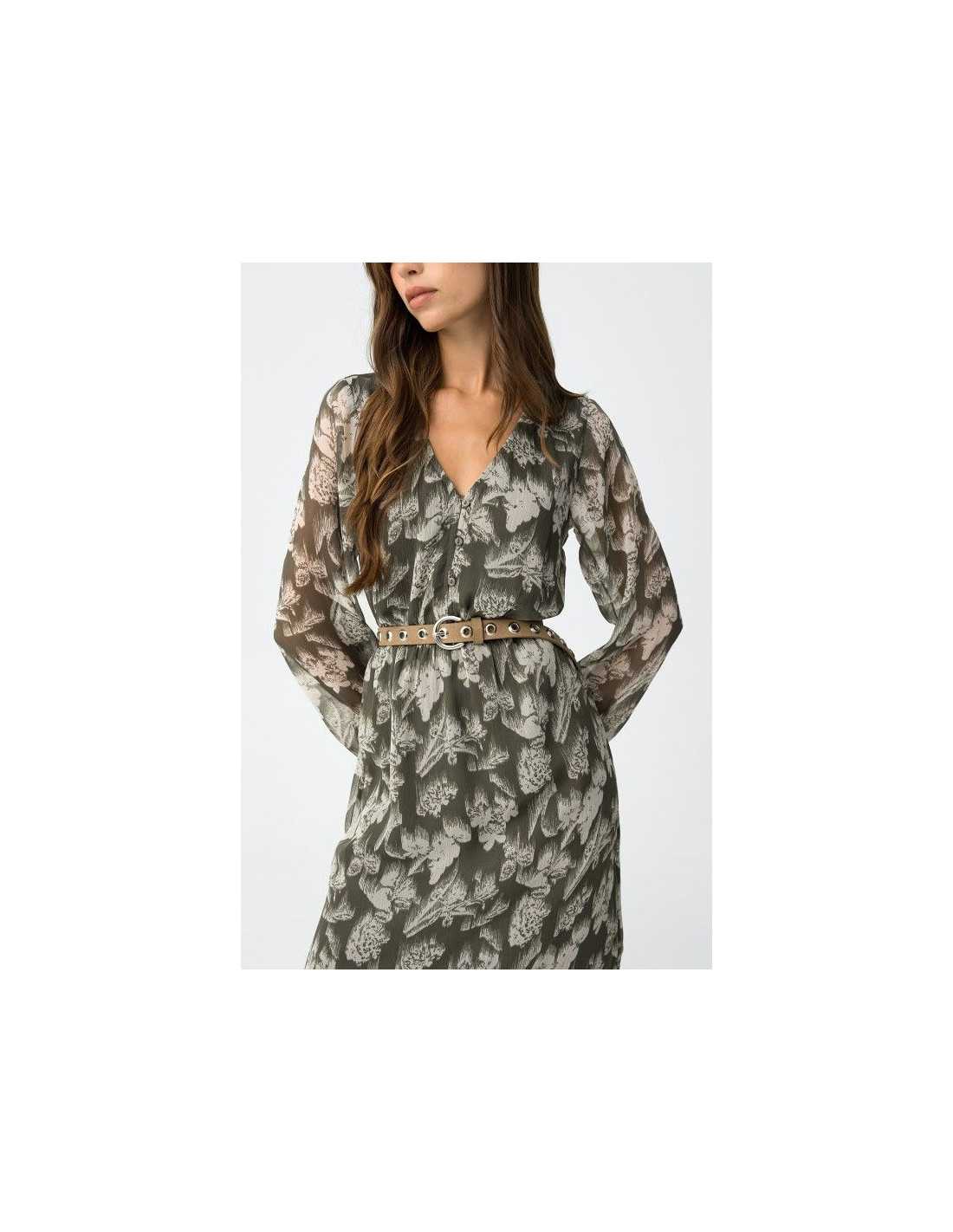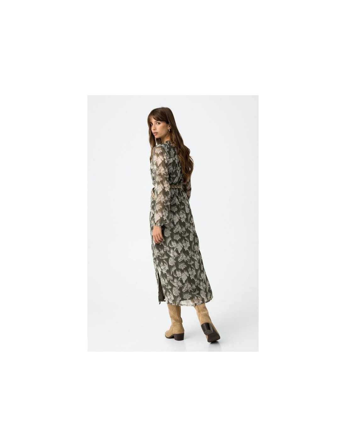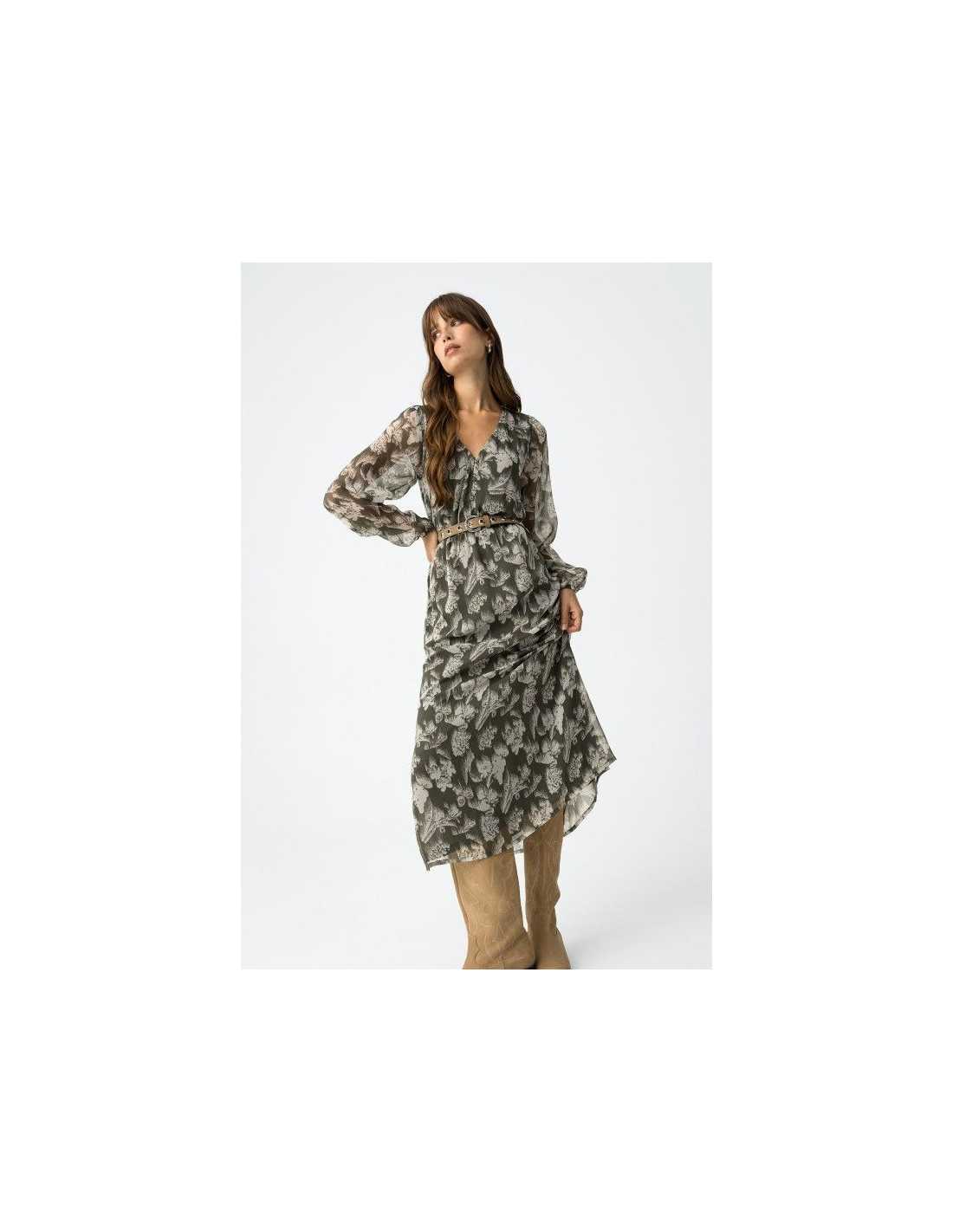 Vestido midi regular fit, semitransparente, con estampado all over y cintura elástica. Escote en V, cierre frontal con botones y manga larga. Interior con forro.