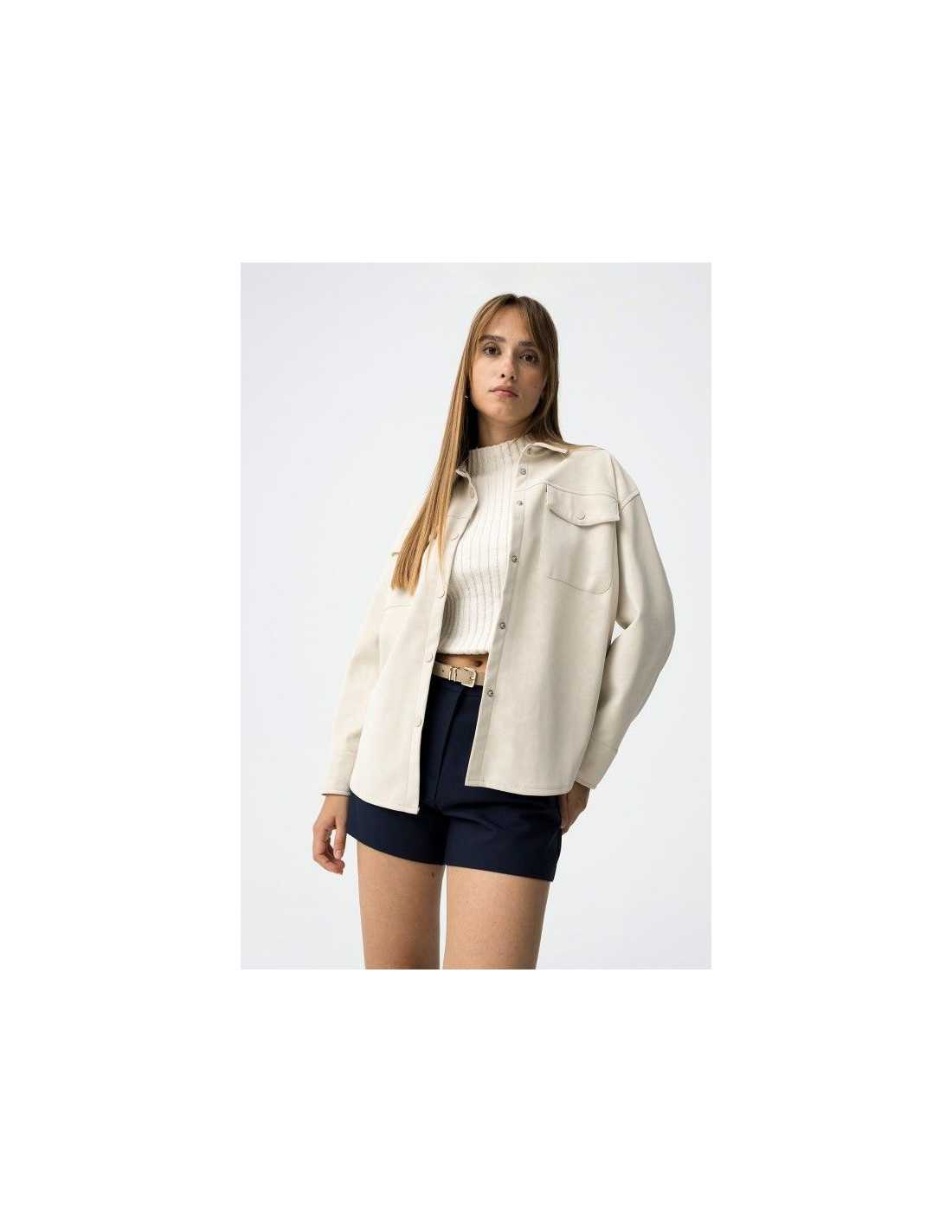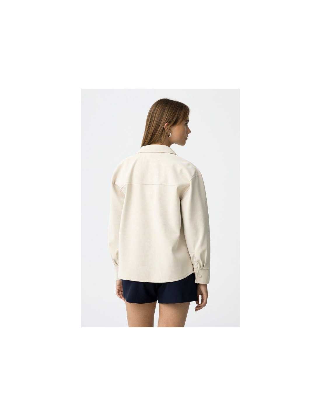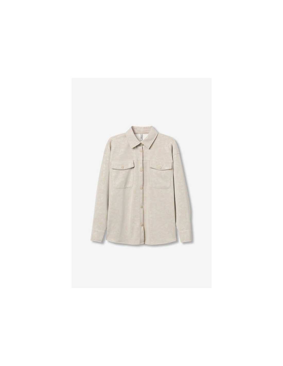 Camisa de corte relajado, con solapa pegada y manga larga con cierre de botones a presión y bolsillos de plastrón. Textura aterciopelada en toda su superficie.
