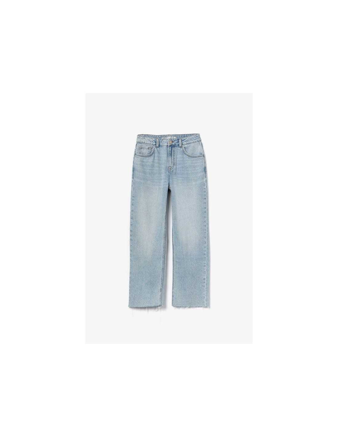 Vaqueros de cintura alta, pierna recta y cinco bolsillos. Cremallera frontal con cremallera y botón metálico. Bajo con acabado deshilachado.