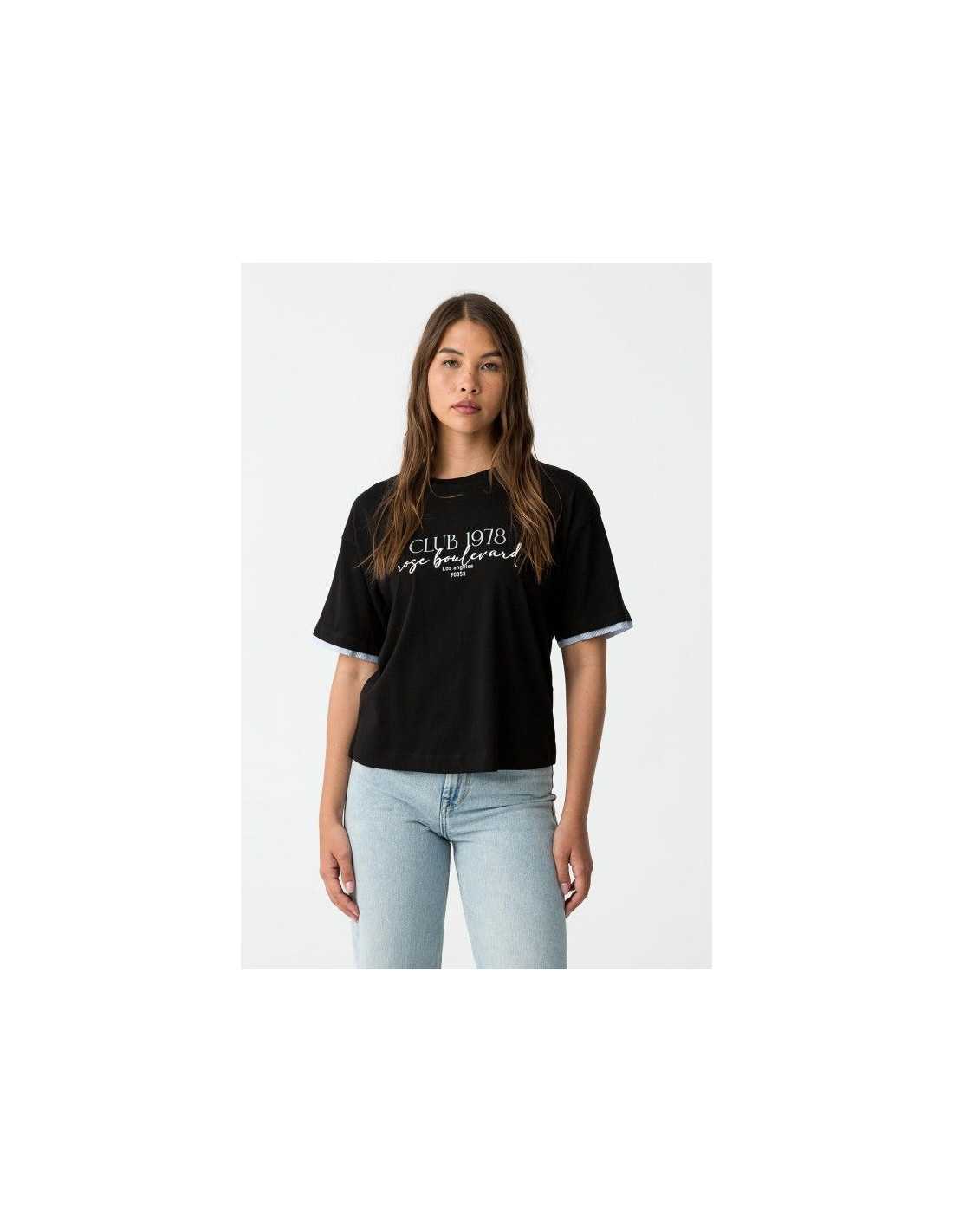 Camiseta de cuello redondo y manga corta. Bordado delantero y aplicaciones efecto camisa en las mangas.