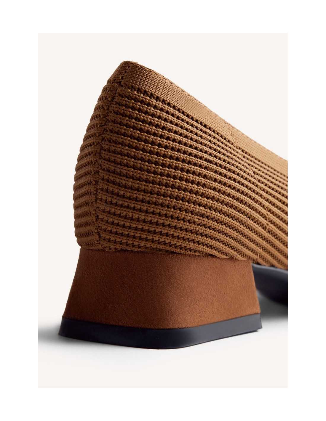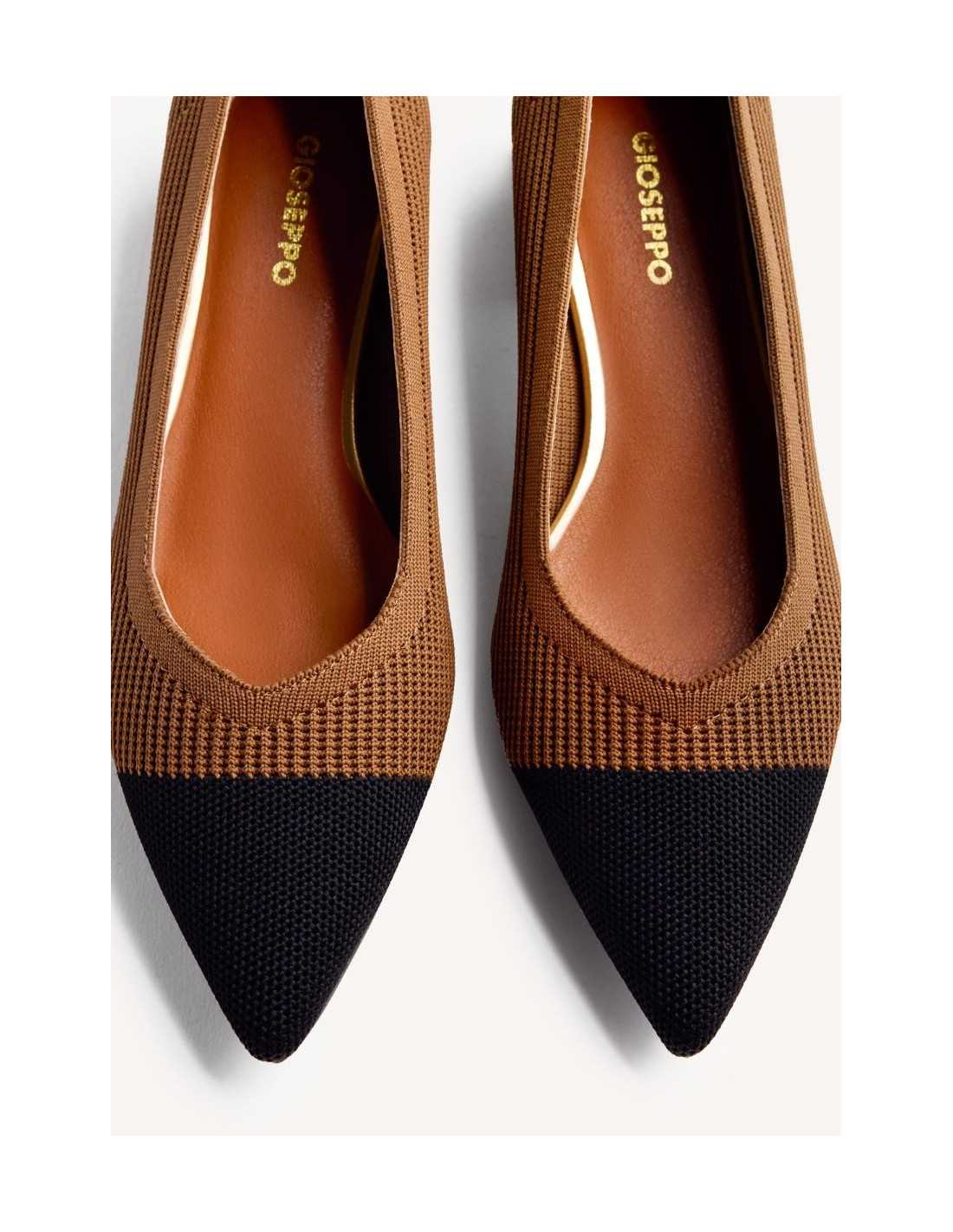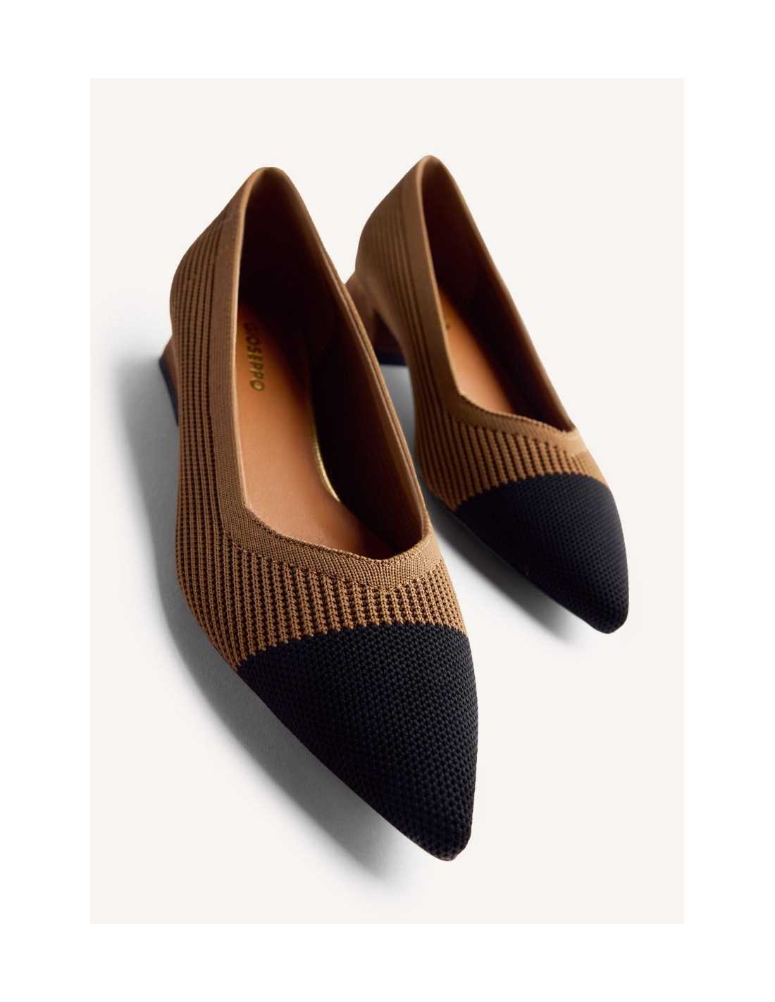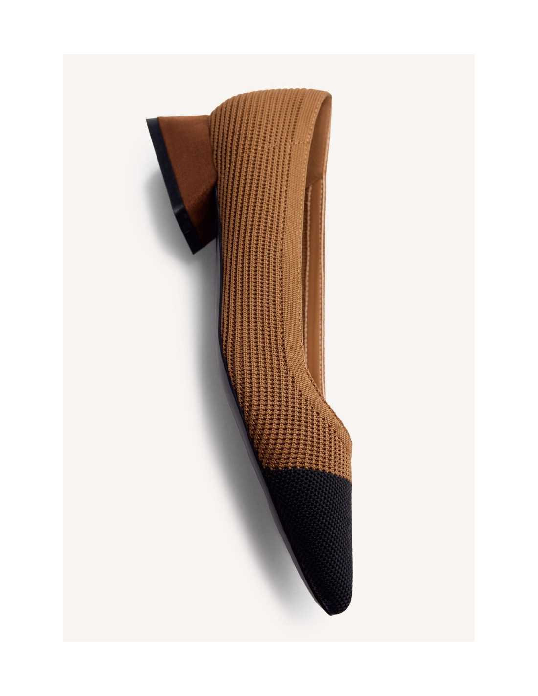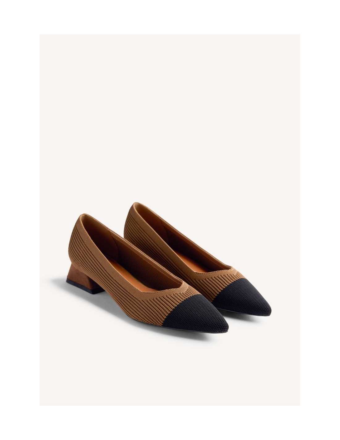 Zapatos de tacón tipo salones con punta afilada en contraste. Cuentan con planta acolchada y tacón bajo tipo bloque. Este modelo destaca por su elasticidad y suavidad. Altura tacón: 3 cm.